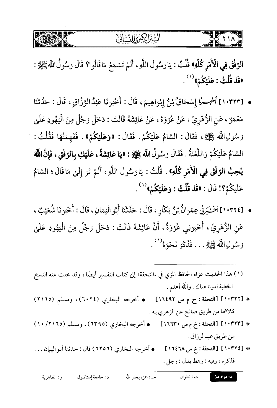 10323- أَخبَرنا إِسحَاقُ بنُ إِبرَاهِيمَ، قَالَ: أَخبَرنا عَبدُ الرَّزَّاقِ، قَالَ: حَدثنا مَعْمَرٌ، عَنِ الزُّهْرِيِّ، عَن عُرْوَةَ، عَن عَائِشَةَ قَالَتْ: دَخَلَ رَجُلٌ مِنَ اليَهُودِ عَلَى رَسُولِ اللهِ صلى الله عليه وسلم فَقَالَ: السَّامُ عَلَيْكُمْ، فَقَالَ: وَعَلَيْكُمْ، فَفَهِمْتُهَا، فَقُلْتُ: السَّامُ عَلَيْكُمْ وَاللَّعْنَةُ، فَقَالَ رَسُولُ اللهِ صلى الله عليه وسلم: يَا عَائِشَةُ، عَلَيْكِ بِالرِّفْقِ، فَإِنَّ اللهَ يُحِبُّ الرِّفْقَ فِي الأَمْرِ كُلِّهِ، قُلْتُ: يَا رَسُولَ اللهِ، أَلَمْ تَرَ إِلَى مَا قَالَ، السَّامُ عَلَيْكُمْ؟! قَالَ: قَدْ قُلْتُ: وَعَلَيْكُمْ.