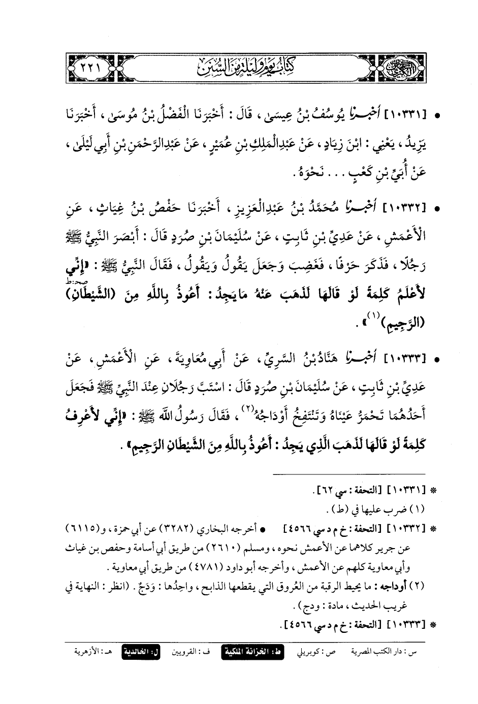 10332- أَخبَرنا مُحَمدُ بنُ عَبدِ العَزِيزِ، أَخبَرنا حَفْصُ بنُ غِيَاثٍ، عَنِ الأَعْمَشِ، عَن عَدِيِّ بنِ ثَابِتٍ، عَن سُلَيمَانَ بنِ صُرَدٍ قَالَ: أَبْصَرَ النَّبيُّ صَلى الله عَليه وسَلم رَجُلاً، فَذَكَرَ حَرْفًا فَغَضِبَ وَجَعَلَ يَقُولُ وَيَقُولُ، فَقَالَ النَّبيُّ صَلى الله عَليه وسَلم: إِنِّي لأَعْلَمُ كَلِمَةً لَوْ قَالَهَا لَذَهَبَ عَنهُ مَا يَجِدُ: أَعُوذُ بِاللهِ مِنَ الشَّيْطَانِ الرَّجِيمِ.