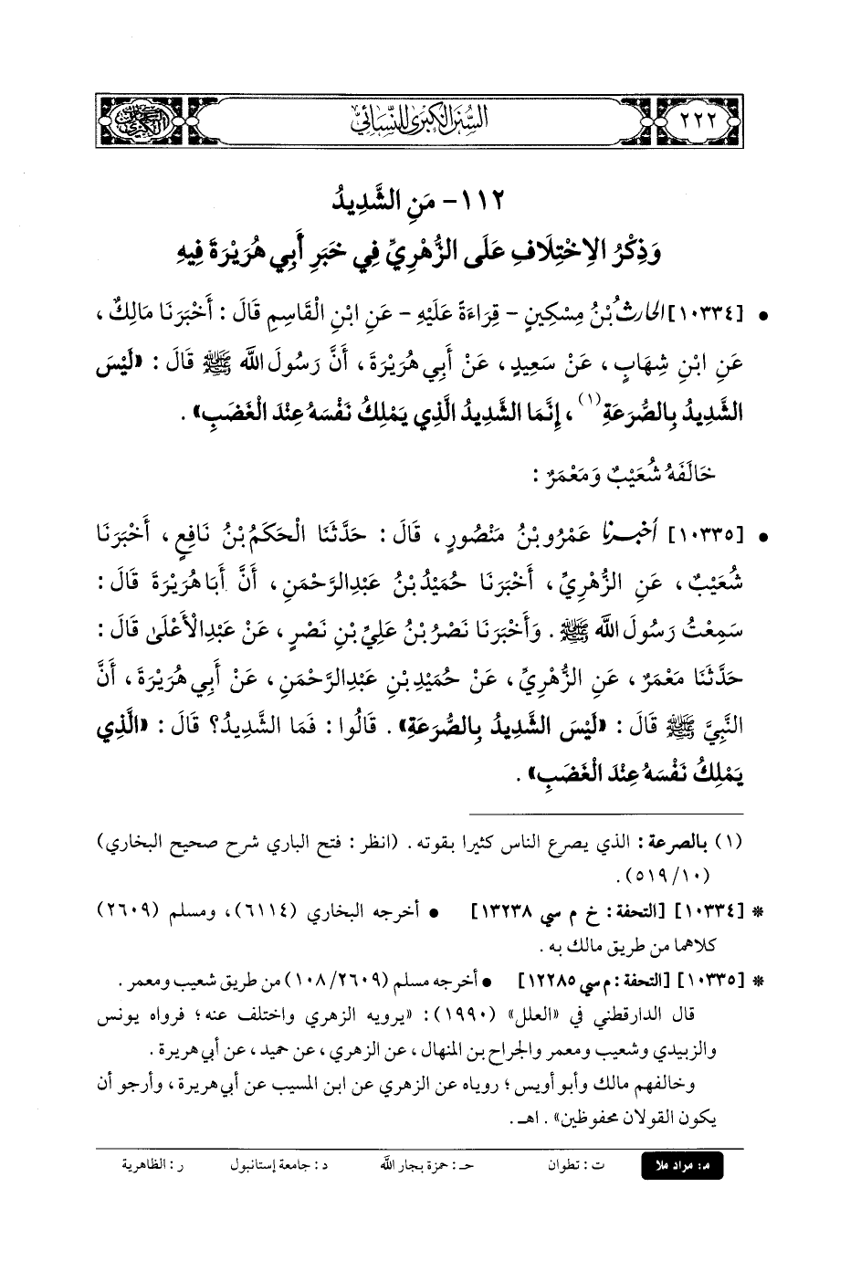 10334- الحَارِثُ بنُ مِسْكِينٍ، قِرَاءَةً عَلَيْهِ، عَنِ ابنِ القَاسِمِ، قَالَ: أَخبَرنا مَالِكٌ، عَنِ ابنِ شِهَابٍ، عَن سَعِيدٍ، عَن أَبي هُرَيرَةَ، أَنَّ رَسُولَ اللهِ صَلى الله عَليه وسَلم قَالَ: لَيْسَ الشَّدِيدُ بِالصُّرَعَةِ، إِنَّمَا الشَّدِيدُ الَّذِي يَمْلِكُ نَفْسَهُ عِنْدَ الغَضَبِ.