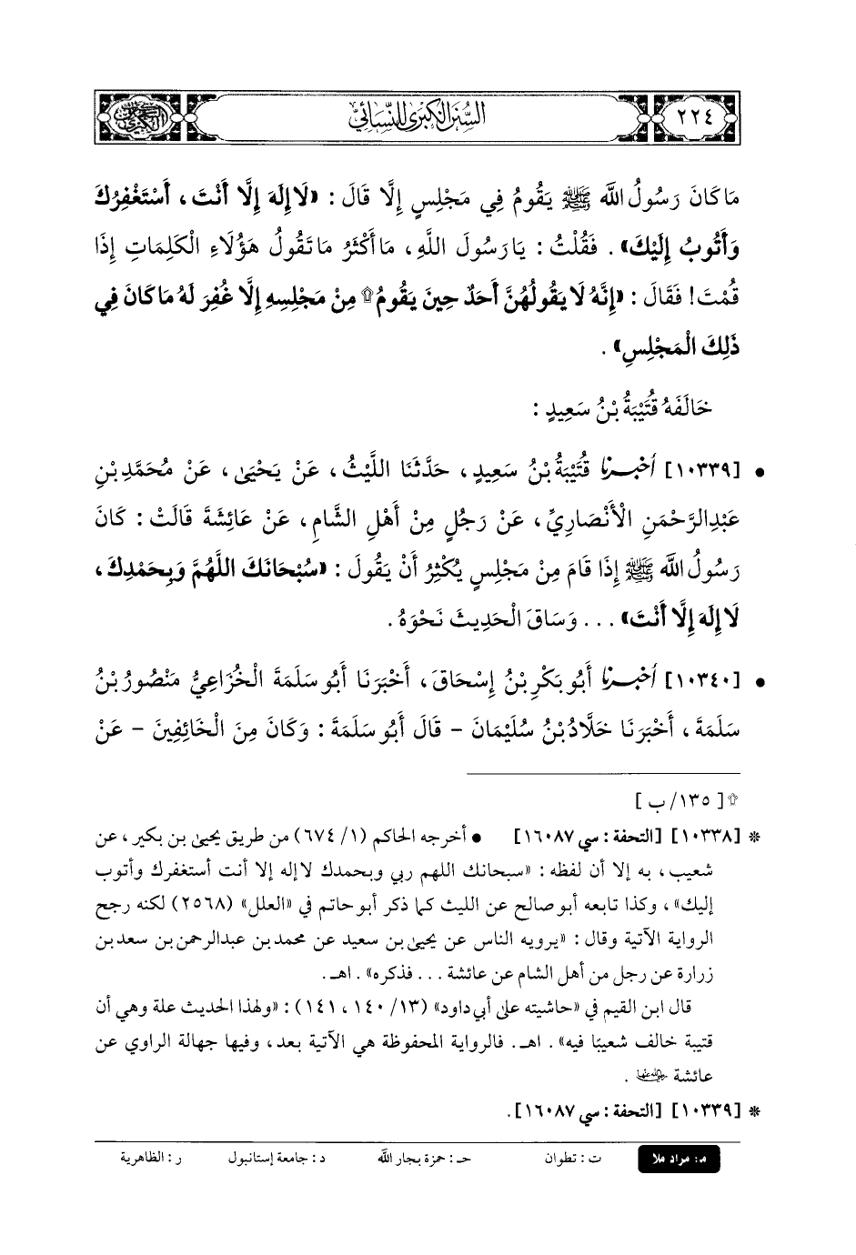 10339- أَخبَرنا قُتَيبَةُ بنُ سَعِيدٍ، حَدثنا اللَّيْثُ، عَن يَحيَى، عَن مُحَمدِ بنِ عَبدِ الرَّحمَنِ الأَنْصَارِيِّ، عَن رَجُلٍ مِنْ أَهْلِ الشَّامِ، عَن عَائِشَةَ، قَالَتْ: كَانَ رَسُولُ اللهِ صَلى الله عَليه وسَلم إِذَا قَامَ مِنْ مَجْلِسٍ يُكْثِرُ أَنْ يَقُولَ: سُبْحَانَكَ اللهُمَّ وَبِحَمْدِكَ، لا إِلَهَ إِلاَّ أَنْتَ ... وَسَاقَ الحَدِيثَ نَحْوَهُ.