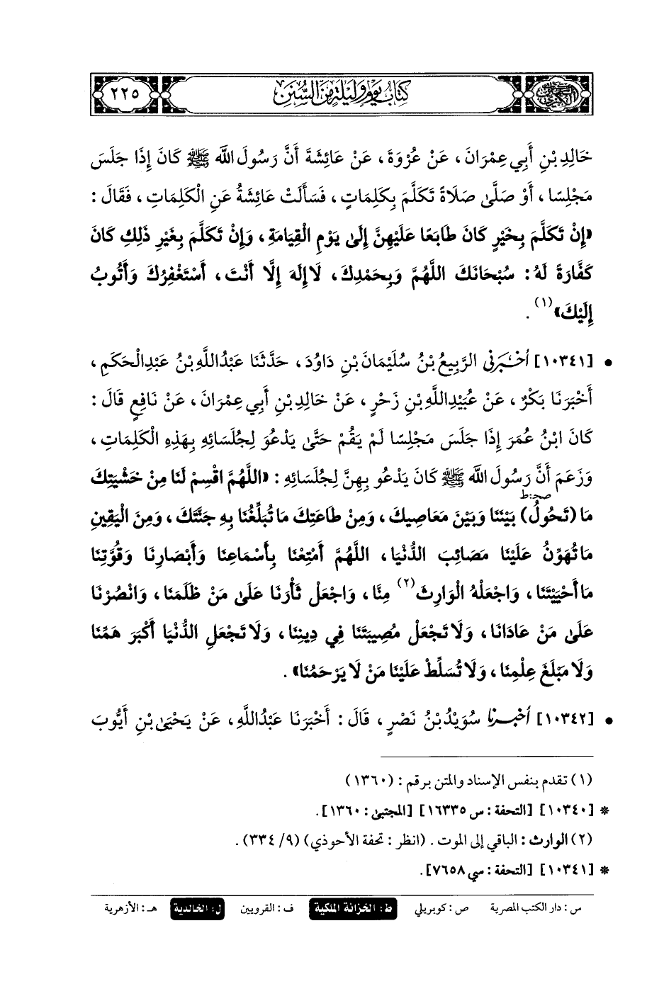 10340- أَخبَرنا أَبو بَكْرِ بنُ إِسحَاقَ، أَخبَرنا أَبو سَلَمَةَ الخُزَاعِيُّ مَنصُورُ بنُ سَلَمَةَ، أَخبَرنا خَلاَّدُ بنُ سُلَيمَانَ، قَالَ أَبو سَلَمَةَ: وَكَانَ مِنَ الخَائِفِينَ، عَن خَالِدِ بنِ أَبي عِمْرَانَ، عَن عُرْوَةَ، عَن عَائِشَةَ، أَنَّ رَسُولَ اللهِ صَلى الله عَليه وسَلم كَانَ إِذَا جَلَسَ مَجْلِسًا أَوْ صَلَّى صَلاةً تَكَلَّمَ بِكَلِمَاتٍ، فَسَأَلَتْ عَائِشَةُ عَنِ الكَلِمَاتِ، فَقَالَ: إِنْ تَكَلَّمَ بِخَيْرٍ كَانَ طَابِعًا عَلَيْهِنَّ إِلَى يَوْمِ القِيَامَةِ، وَإِنْ تَكَلَّمَ بِغَيْرِ ذَلِكَ كَانَ كَفَّارَةً لَهُ: سُبْحَانَكَ اللهُمَّ وَبِحَمْدِكَ، لا إِلَهَ إِلاَّ أَنْتَ، أَسْتَغْفِرُكَ وَأَتُوبُ إِلَيْكَ.