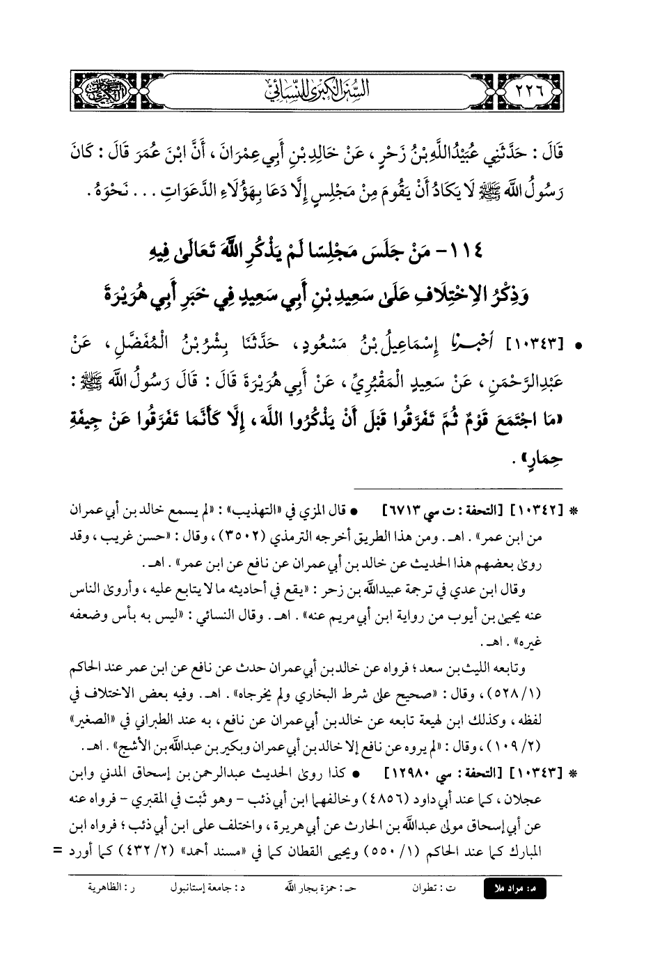 10342- أَخبَرنا سُوَيْدُ بنُ نَصْرٍ، قَالَ: أَخبَرنا عَبدُ اللهِ، عَن يَحيَى بنِ أَيوبَ، قَالَ: حَدَّثني عُبَيدُ اللهِ بنُ زَحْرٍ، عَن خَالِدِ بنِ أَبي عِمْرَانَ، أَنَّ ابنَ عُمَرَ قَالَ: كَانَ رَسُولُ اللهِ صَلى الله عَليه وسَلم لا يَكَادُ أَنْ يَقُومَ مِنْ مَجْلِسٍ إِلاَّ دَعَا بِهَؤُلاءِ الدَّعَوَاتِ، نَحْوَهُ.