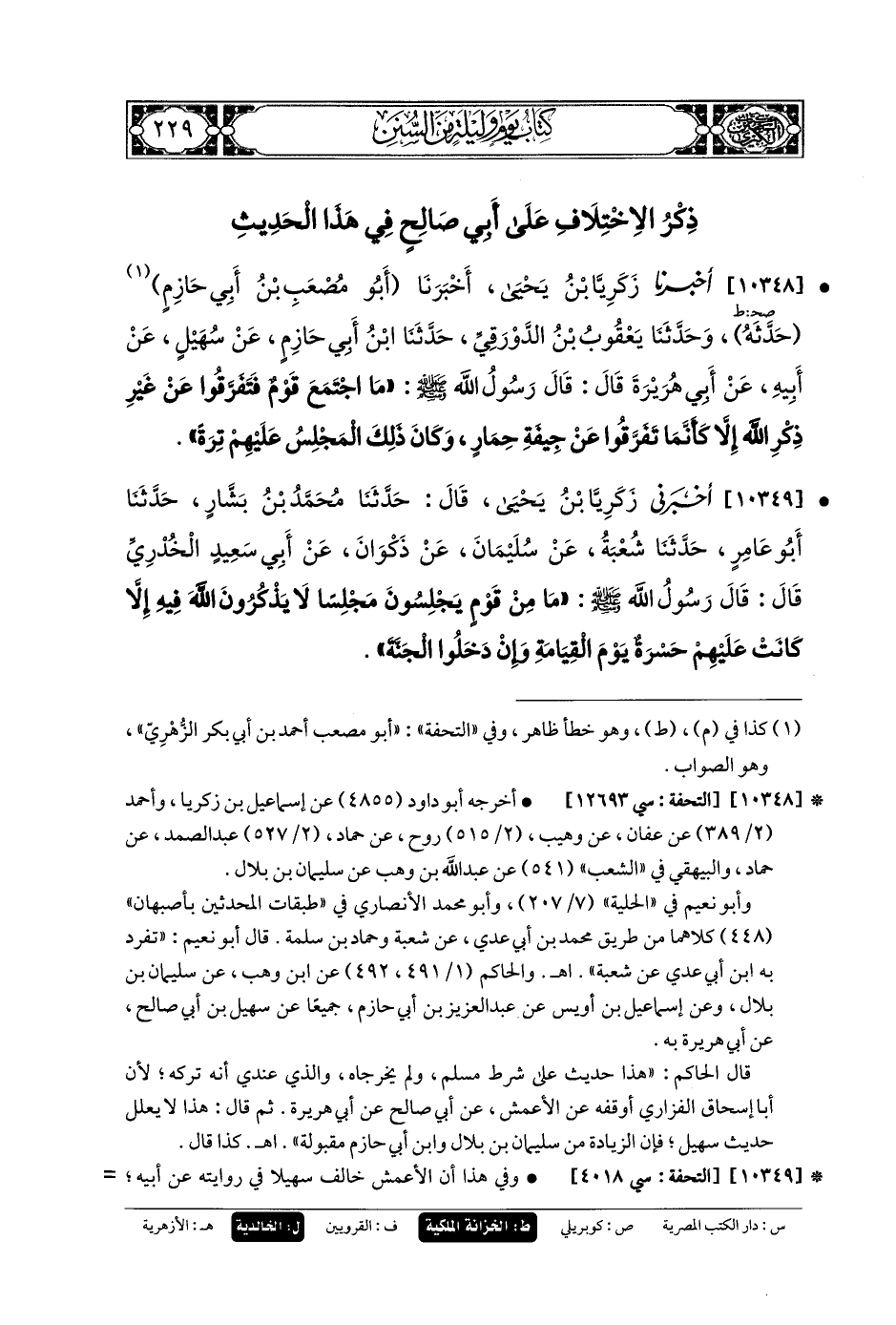 10348- أَخبَرنا زَكَرِيَّا بنُ يَحيَى، أَخبَرنا أَبو مُصْعَبٍ، عَنِ ابنِ أَبي حَازِمٍ (1) حَدَّثَهُ، وَحَدثنا يَعقُوبُ بنُ الدَّوْرَقِيِّ، حَدثنا ابنُ أَبي حَازِمٍ، عَن سُهَيلٍ، عَن أَبيهِ، عَن أَبي هُرَيرَةَ قَالَ: قَالَ رَسُولُ اللهِ صَلى الله عَليه وسَلم: مَا اجْتَمَعَ قَوْمٌ فَتَفَرَّقُوا عَن غَيْرِ ذِكْرِ اللهِ إِلاَّ كَأَنَّمَا تَفَرَّقُوا عَن جِيفَةِ حِمَارٍ، وَكَانَ ذَلِكَ المَجْلِسُ عَلَيْهِمْ تِرَةً.