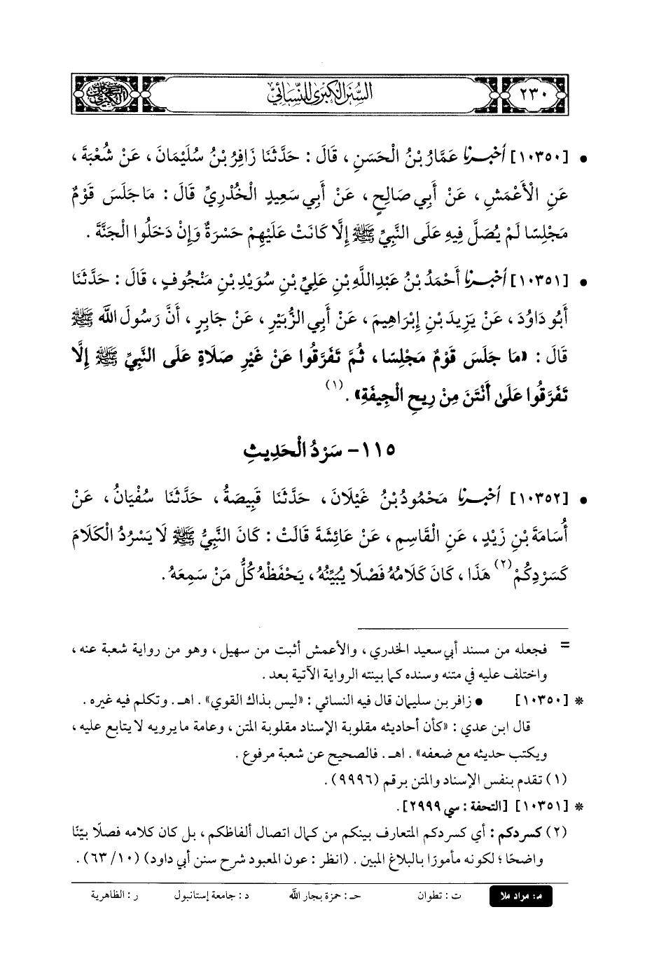 10350- أَخبَرنا عَمَّارُ بنُ الحَسَنِ، قَالَ: حَدثنا زَافِرُ بنُ سُلَيمَانَ، عَن شُعبَةَ، عَنِ الأَعْمَشِ، عَن أَبي صَالِحٍ، عَن أَبي سَعِيدٍ الخُدْرِيِّ قَالَ: مَا جَلَسَ قَوْمٌ مَجْلِسًا لَمْ يُصَلَّ فِيهِ عَلَى النَّبيِّ صَلى الله عَليه وسَلم، إِلاَّ كَانَتْ عَلَيْهِمْ حَسْرَةً وَإِنْ دَخَلُوا الجَنَّةَ.