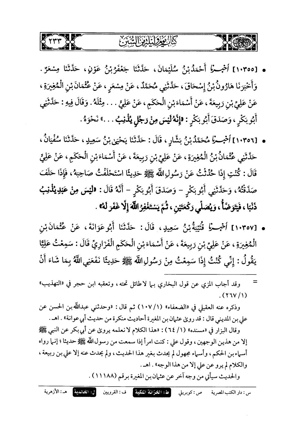 10355- أَخبَرنا أَحْمَدُ بنُ سُلَيمَانَ، حَدثنا جَعفَرُ بنُ عَوْنٍ، حَدثنا مِسْعَرٌ (ح) وَأَخبَرنا هَارُونُ بنُ إِسحَاقَ، حَدَّثني مُحَمدٌ، عَن مِسْعَرٍ، عَن عُثْمَانَ بنِ المُغِيرَةِ، عَن عَليِّ بنِ رَبِيعَةَ، عَن أَسْمَاءَ بنِ الحَكَمِ، عَن عَليٍّ، مِثْلَهُ، وَقَالَ فِيهِ: حَدَّثني أَبو بَكْرٍ، وَصَدَقَ أَبو بَكْرٍ: إِنَّهُ لَيْسَ مِنْ رَجُلٍ يُذْنِبُ نَحْوَهُ.