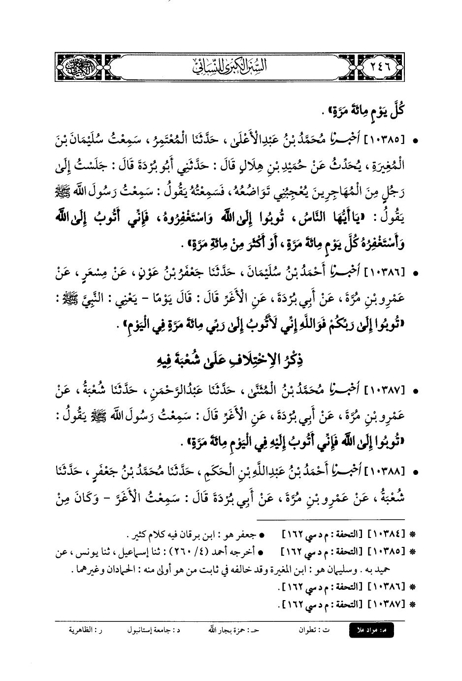 10387- أَخبَرنا مُحَمدُ بنُ المُثَنَّى، حَدثنا عَبدُ الرَّحمَنِ، حَدثنا شُعبَةُ، عَن عَمْرِو بنِ مُرَّةَ، عَن أَبي بُرْدَةَ، عَنِ الأَغَرِّ، قَالَ: سَمِعْتُ رَسُولَ اللهِ صَلى الله عَليه وسَلم يَقُولُ: تُوبُوا إِلَى اللهِ، فَإِنِّي أَتُوبُ إِلَيْهِ فِي اليَوْمِ مِئَةَ مَرَّةٍ.