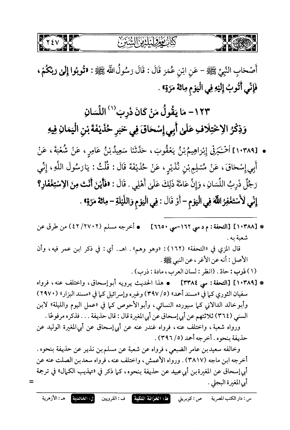 10388- أَخبَرنا أَحْمَدُ بنُ عَبدِ اللهِ بنِ الحَكَمِ، حَدثنا مُحَمدُ بنُ جَعفَرٍ، حَدثنا شُعبَةُ، عَن عَمْرِو بنِ مُرَّةَ، عَن أَبي بُرْدَةَ، قَالَ: سَمِعْتُ الأَغَرَّ، وَكَانَ مِنْ أَصْحَابِ النَّبيِّ صَلى الله عَليه وسَلم، عَنِ ابنِ عُمَرَ قَالَ: قَالَ رَسُولُ اللهِ صَلى الله عَليه وسَلم: تُوبُوا إِلَى رَبِّكُمْ، فَإِنِّي أَتُوبُ إِلَيْهِ فِي اليَوْمِ مِئَةَ مَرَّةٍ.