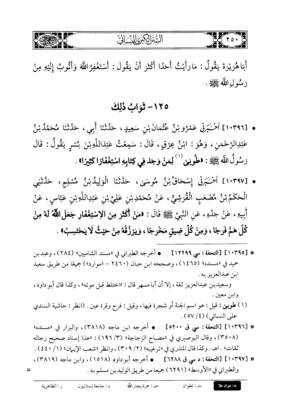 10396 - أَخبَرني عَمرُو بنُ عُثْمَانَ بنِ سَعِيدٍ، حَدثنا أَبي، حَدثنا مُحَمدُ بنُ عَبدِ الرَّحمَنِ، وَهُوَ ابنُ عِرْقٍ، قَالَ: سَمِعْتُ عَبدَ اللهِ بْنَ بُسْرٍ يَقُولُ: قَالَ رَسُولُ اللهِ صَلى الله عَليه وسَلم: طُوبَى لِمَنْ وَجَدَ فِي كِتَابِهِ اسْتِغْفَارًا كَثِيرًا.