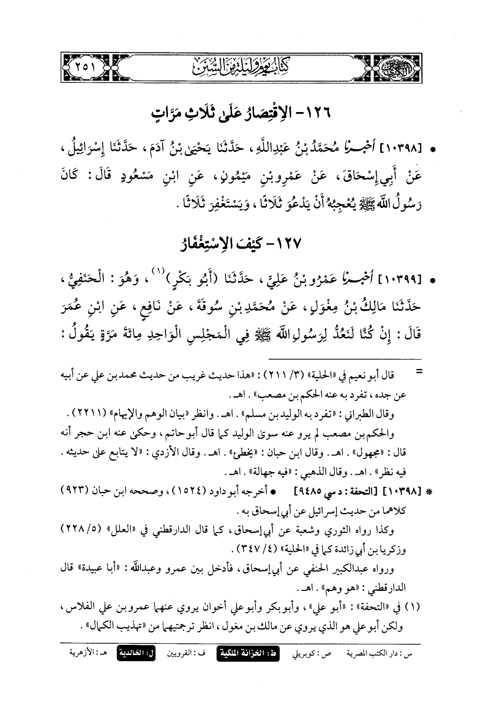 10398- أَخبَرنا مُحَمدُ بنُ عَبدِ اللهِ، حَدثنا يَحيَى بنُ آدَمَ، حَدثنا إِسرَائِيلُ، عَن أَبي إِسحَاقَ، عَن عَمْرِو بنِ مَيْمُونٍ، عَنِ ابنِ مَسْعُودٍ قَالَ: كَانَ رَسُولُ اللهِ صَلى الله عَليه وسَلم يُعْجِبُهُ أَنْ يَدْعُوَ ثَلاثًا، وَيَسْتَغْفِرَ ثَلاثًا.