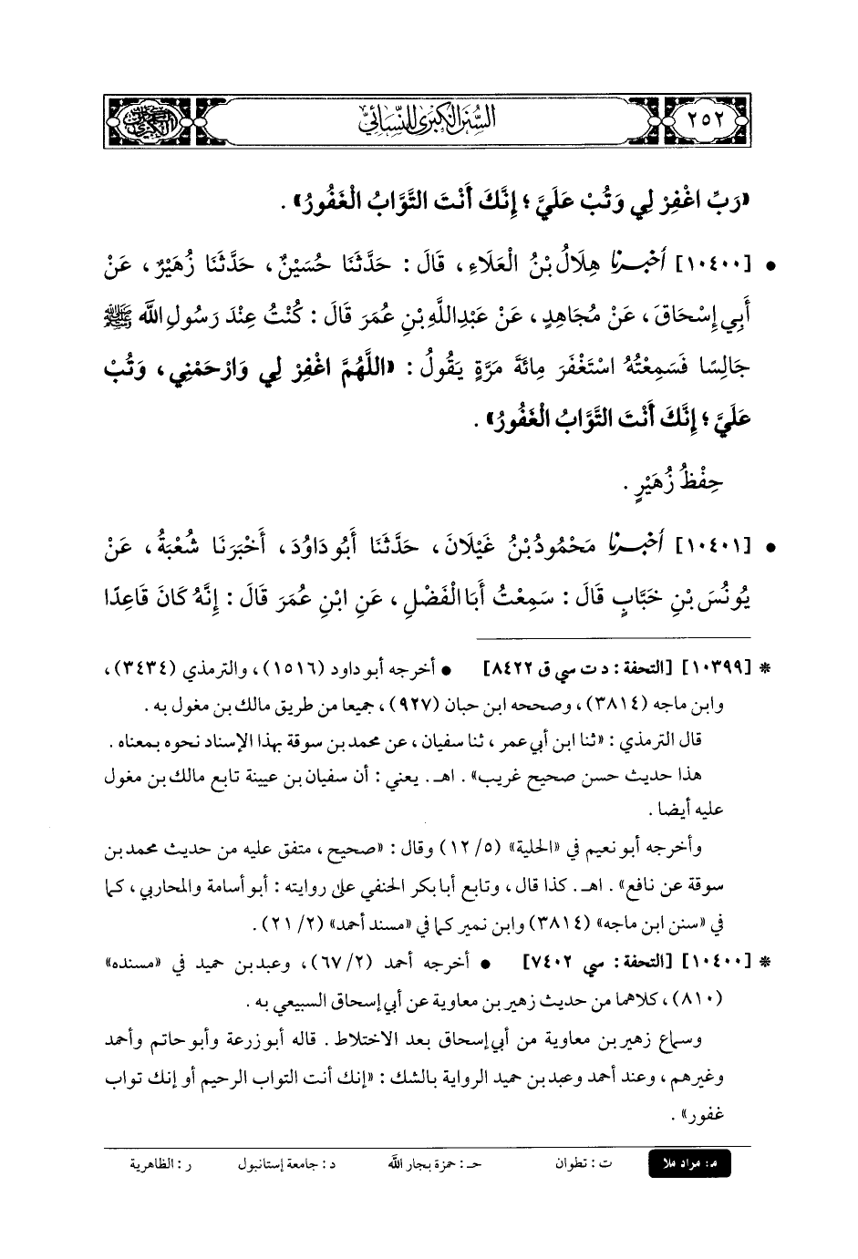10400- أَخبَرنا هِلالُ بنُ العَلاءِ، قَالَ: حَدثنا حُسَيْنٌ، حَدثنا زُهَيْرٌ، عَن أَبي إِسحَاقَ، عَن مُجَاهِدٍ، عَن عَبدِ اللهِ بنِ عُمَرَ قَالَ: كُنْتُ عِنْدَ رَسُولِ اللهِ صَلى الله عَليه وسَلم جَالِسًا، فَسَمِعْتُهُ اسْتَغْفَرَ مِئَةَ مَرَّةٍ يَقُولُ: اللهُمَّ اغْفِرْ لِي، وَارْحَمْنِي، وَتُبْ عَلَيَّ، إِنَّكَ أَنْتَ التَّوَّابُ الغَفُورُ، حِفْظَ زُهَيْرٍ.