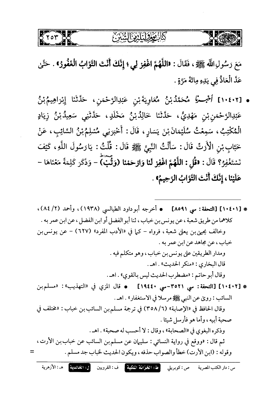 10401- أَخبَرنا مَحْمُودُ بنُ غَيْلانَ، حَدثنا أَبو دَاوُدَ، أَخبَرنا شُعبَةُ، عَن يُونُسَ بنِ خَبَّابٍ، قَالَ: سَمِعْتُ أَبَا الفَضْلِ، عَنِ ابنِ عُمَرَ، قال: إنَّهُ كَانَ قَاعِدًا مَعَ رَسُولِ اللهِ صَلى الله عَليه وسَلم فَقَالَ: اللهُمَّ اغْفِرْ لِي، إِنَّكَ أَنْتَ التَّوَّابُ الغَفُورُ، حَتَّى عَدَّ العَادُّ فِي يَدِهِ مِئَةَ مَرَّةٍ.