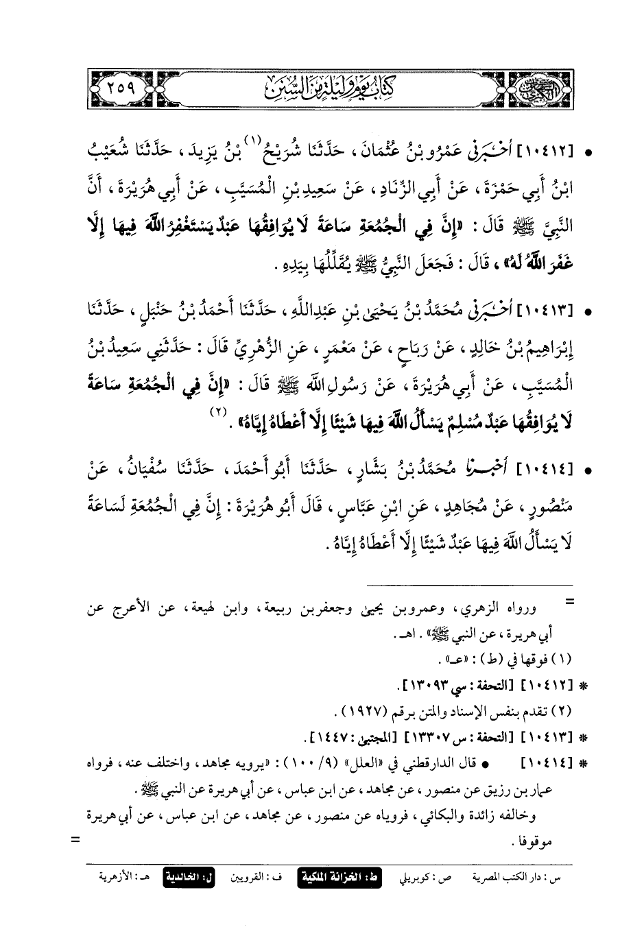 10412- أَخبَرني عَمرُو بنُ عُثْمَانَ، حَدثنا شُرَيْحُ بنُ يَزِيدَ، حَدثنا شُعَيبُ بنُ أَبي حَمْزَةَ، عَن أَبي الزِّنَادِ، عَن سَعِيدِ بنِ المُسَيَّبِ، عَن أَبي هُرَيرَةَ، أَنَّ النَّبيَّ صَلى الله عَليه وسَلم قَالَ: إِنَّ فِي الجُمُعَةِ سَاعَةً لا يُوَافِقُهَا عَبدٌ يَسْتَغْفِرُ اللهَ فِيهَا إِلاَّ غَفَرَ اللهُ لَهُ، قَالَ: فَجَعَلَ النَّبيُّ صَلى الله عَليه وسَلم يُقَلِّلُهَا بِيَدِهِ.