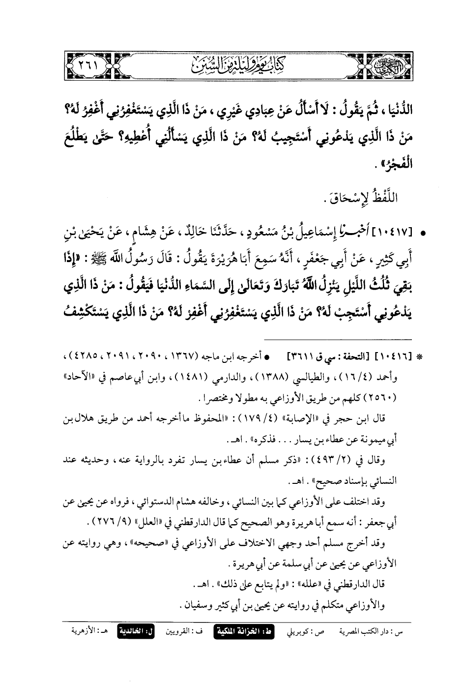 10416- أَخبَرنا إِسحَاقُ بنُ مَنصُورٍ، حَدثنا أَبو المُغِيرَةِ، حَدثنا الأَوْزَاعِيُّ، حَدثنا يَحيَى (ح) وَأَخبَرنا هِشَامُ بنُ عَمَّارٍ، عَن يَحيَى، قَالَ: حَدثنا الأَوْزَاعِيُّ، عَن يَحيَى، عَن هِلالٍ، عَن عَطَاءِ بنِ يَسَارٍ، عَن رِفَاعَةَ بنِ عَرَابَةَ الجُهَنِيِّ قَالَ: قَالَ رَسُولُ اللهِ صَلى الله عَليه وسَلم: إِذَا مَضَى مِنَ اللَّيْلِ نِصْفُهُ أَوْ ثُلُثَاهُ، هَبَطَ اللهُ إِلَى السَّمَاءِ الدُّنْيَا، ثُمَّ يَقُولُ: لا أَسْأَلُ عَن عِبَادِي غَيْرِي، مَنْ ذَا الَّذِي يَسْتَغْفِرُنِي أَغْفِرُ لَهُ؟ مَنْ ذَا الَّذِي يَدْعُونِي أَسْتَجِيبُ لَهُ؟ مَنْ ذَا الَّذِي يَسْأَلُنِي أُعْطِيهِ؟ حَتَّى يَطْلُعَ الفَجْرُ.