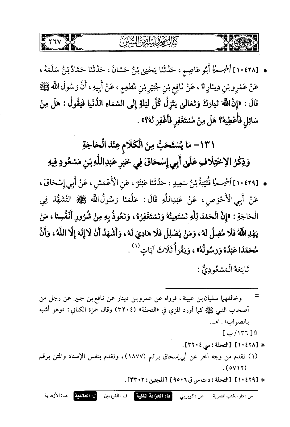10427- أَخبَرنا زَكَرِيَّا بنُ يَحيَى، حَدثنا عَبدُ الرَّحمَنِ بنُ إِبرَاهِيمَ، حَدثنا ابنُ أَبي فُدَيْكٍ، حَدَّثني ابنُ أَبي ذِئْبٍ، عَنِ القَاسِمِ بنِ عَبَّاسٍ، عَن نَافِعِ بنِ جُبَيرٍ، عَن أَبي هُرَيرَةَ، أَنَّ النَّبيَّ صَلى الله عَليه وسَلم قَالَ: يَنْزِلُ اللهُ شَطْرِ اللَّيْلِ فَيَقُولُ: مَنْ يَدْعُونِي فَأَسْتَجِيبَ لَهُ؟ مِنْ يَسْأَلُنِي فَأُعْطِيَهُ؟ مَنْ يَسْتَغْفِرُنِي فَأَغْفِرَ لَهُ؟ فَلا يَزَالُ كَذَالِكَ حَتَّى ترَجَّلَ الشَّمْسُ.