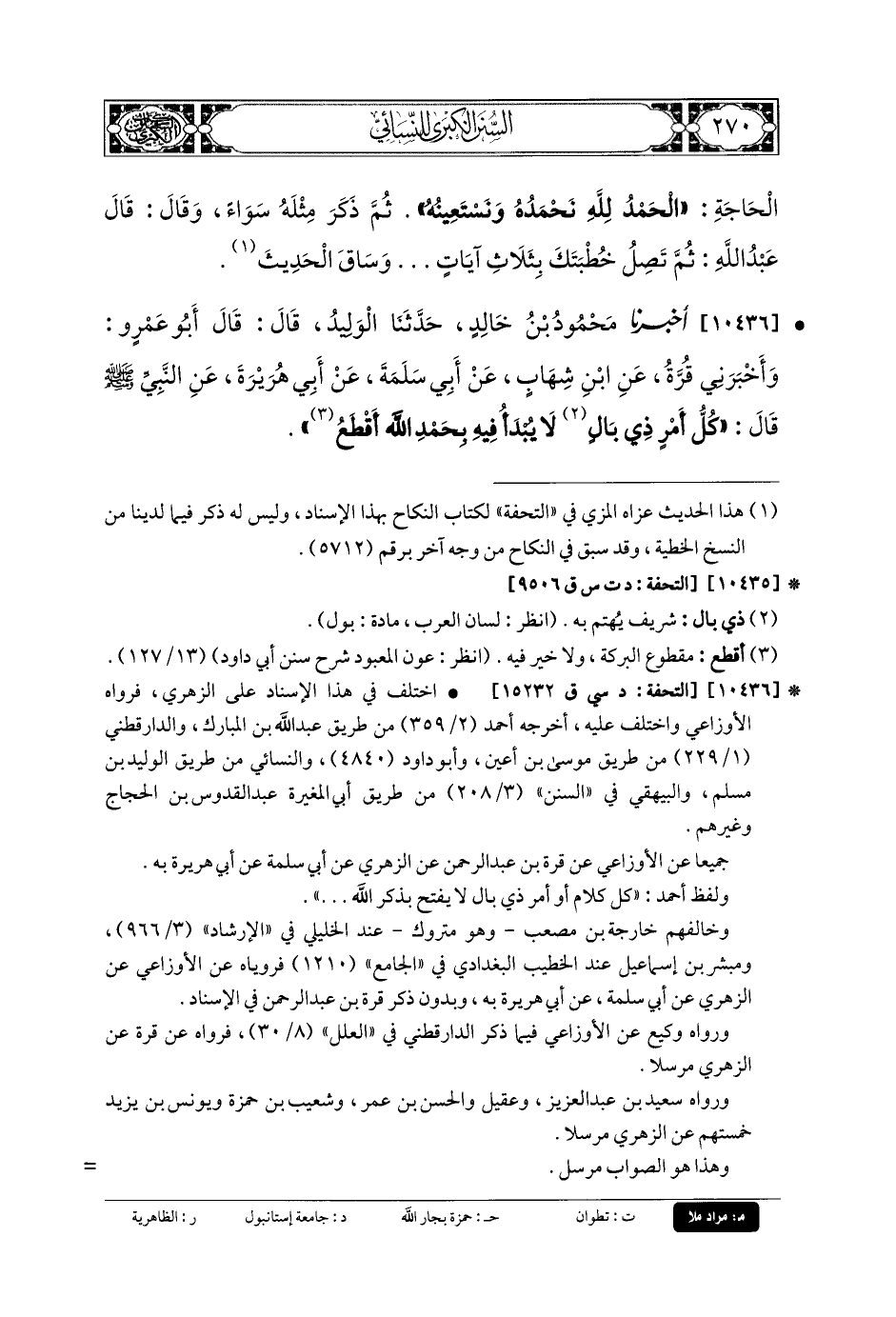 10435- أَخبَرنا مُحَمدُ بنُ المُثَنَّى عَن حَدِيثِ عَبدِ الرَّحمَنِ، حَدثنا إِسرَائِيلُ، عَن أَبي إِسحَاقَ، عَن أَبي الأَحْوَصِ، وَأَبي عُبَيدَةَ، (1) عَن عَبدِ اللهِ، قَالَ: عَلَّمَنَا رَسُولُ اللهِ صَلى الله عَليه وسَلم خُطْبَةَ الحَاجَةِ: الحَمْدُ للهِ، نَحْمَدُهُ وَنَسْتَعِينُهُ ... ثُمَّ ذَكَرَ مِثْلَهُ سَوَاءٌ، وَقَالَ: قَالَ عَبدُ اللهِ: ثُمَّ تَصِلُ خُطْبَتَكَ بِثَلاثِ آيَاتٍ ... وَسَاقَ الحَدِيثَ.