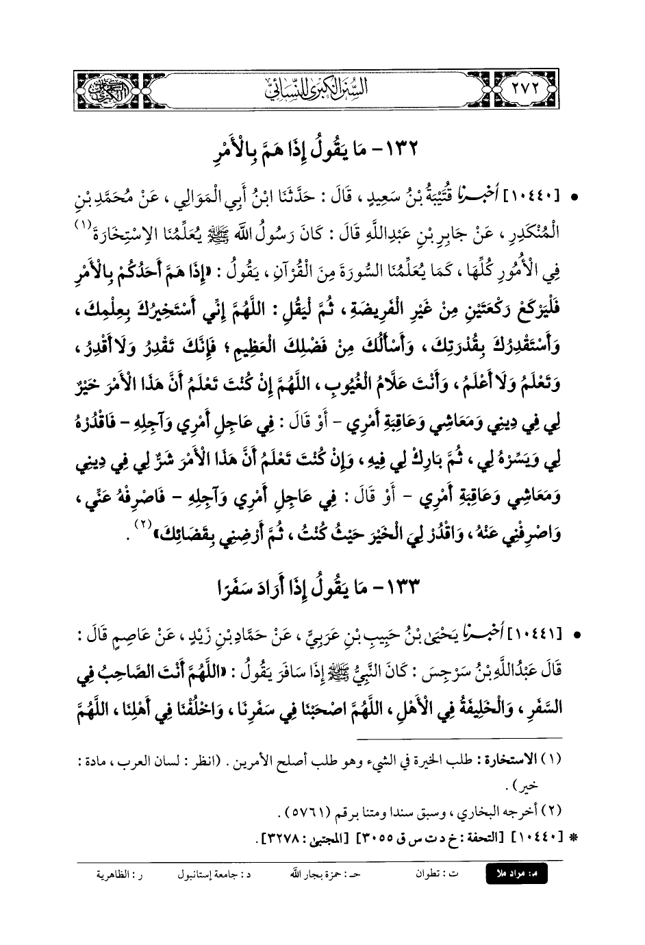 10440- أَخبَرنا قُتَيبَةُ بنُ سَعِيدٍ، قَالَ: حَدثنا ابنُ أَبيُ المَوَالِي، عَن مُحَمدِ بنِ المُنْكَدِرِ، عَن جَابِرِ بنِ عَبدِ اللهِ، قَالَ: كَانَ رَسُولُ اللهِ صَلى الله عَليه وسَلم يُعَلِّمُنَا الاِسْتِخَارَةَ فِي الأُمُورِ كُلِّهَا، كَمَا يُعَلِّمُنَا السُّورَةَ مِنَ القُرْآنِ يَقُولَ: إِذَا هَمَّ أَحَدُكُمْ بِالأَمْرِ، فَلْيَرْكَعْ رَكْعَتَيْنِ مِنْ غَيْرِ الفَرِيضَةِ، ثُمَّ لِيَقُلْ: اللهُمَّ إِنِّي أَسْتَخِيرُكَ بِعِلْمِكَ، وَأَسْتَقْدِرُكَ بِقُدْرَتِكَ، وَأَسْأَلُكَ مِنْ فَضْلِكَ العَظِيمِ، فَإِنَّكَ تَقْدِرُ وَلا أَقْدِرُ، وَتَعْلَمُ وَلا أَعْلَمُ، وَأَنْتَ عَلاَّمُ الغُيُوبِ، اللهُمَّ إِنْ كُنْتَ تَعْلَمُ أَنَّ هَذَا الأَمْرَ خَيْرٌ لِي فِي دِينِي وَمَعَاشِي وَعَاقِبَةِ أَمْرِي، أَوْ قَالَ: فِي عَاجِلِ أَمْرِي وَآجِلِهِ، فَاقْدُرْهُ لِي، وَيَسِّرْهُ لِي، ثُمَّ بَارِكْ لِي فِيهِ، وَإِنْ كُنْتَ تَعْلَمُ أَنَّ هَذَا الأَمْرَ شَرٌّ لِي فِي دِينِي وَمَعَاشِي وَعَاقِبَةِ أَمْرِي، أَوْ قَالَ: فِي عَاجِلِ أَمْرِي وَآجِلِهِ، فَاصْرِفْهُ عَنِّي، وَاصْرِفْنِي عَنهُ، وَاقْدُرْ لِيَ الخَيْرَ حَيْثُ كُنْتُ، ثُمَّ أَرْضِنِي بِقَضَائِكَ.