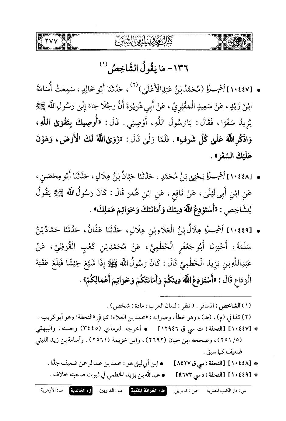 10448- أَخبَرنا يَحيَى بنُ مُحَمدٍ، حَدثنا حَبَّانُ بنُ هِلالٍ، حَدثنا أَبو مِحْصَنٍ، عَنِ ابنِ أَبي لَيْلَى، عَن نَافِعٍ، عَنِ ابنِ عُمَرَ، قَالَ: كَانَ رَسُولُ اللهِ صَلى الله عَليه وسَلم يَقُولُ لِلشَّاخِصِ: أَسْتَوْدِعُ اللهَ دِينَكَ وَأَمَانَتَكَ، وَخَوَاتِمَ عَمَلِكَ.