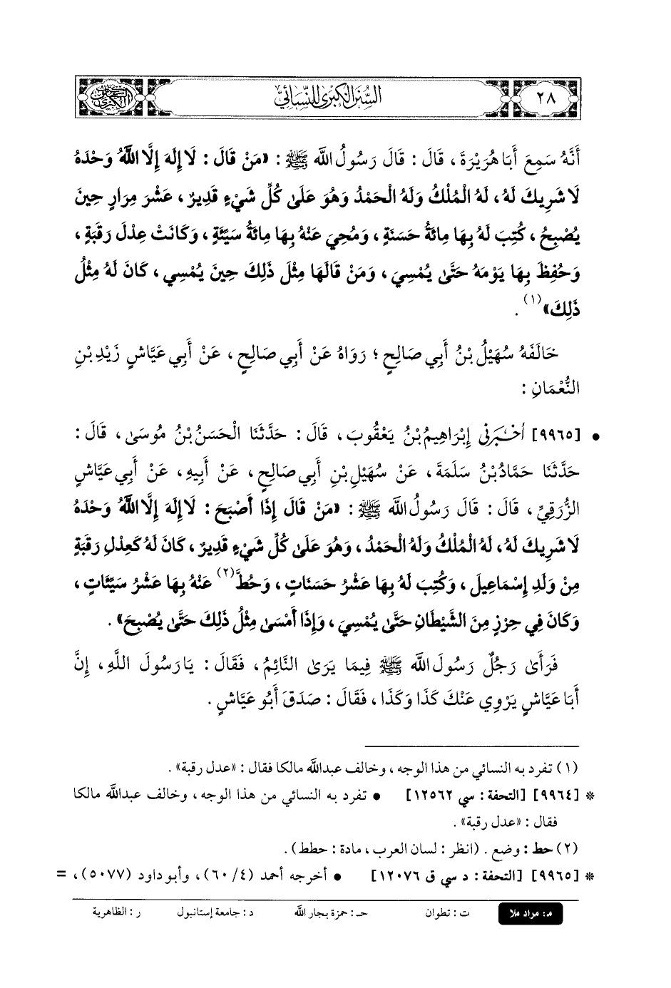 9964- أَخبَرنا عَبدُ اللهِ بنُ الصَّبَّاحِ بنِ عَبدِ اللهِ العَطَّارُ البَصْرِيُّ، قَالَ: حَدثنا مَكِّيُّ بنُ إِبرَاهِيمَ، قَالَ: حَدثنا عَبدُ اللهِ بنُ سَعِيدٍ، عَن سُمَيٍّ، عَن أَبي صَالِحٍ، أَنَّهُ سَمِعَ أَبَا هُرَيرَةَ قَالَ: قَالَ رَسُولُ اللهِ صَلى الله عَليه وسَلم: مَنْ قَالَ: لا إِلَهَ إِلاَّ اللهُ، وَحْدَهُ لا شَرِيكَ لَهُ، لَهُ المُلْكُ، وَلَهُ الحَمْدُ، وَهُوَ عَلَى كُلِّ شَيْءٍ قَدِيرٌ، عَشْرَ مِرَارٍ حِينَ يُصْبِحُ كُتِبَ لَهُ بِهَا مِئَةُ حَسَنَةٍ، وَمُحِيَ عَنهُ بِهَا مِئَةُ سَيِّئَةٍ، وَكَانَتْ عِدْلَ رَقَبَةٍ، وَحُفِظَ بِهَا يَوْمَهُ حَتَّى يُمْسِيَ، وَمَنْ قَالَهَا مِثْلَ ذَلِكَ حِينَ يُمْسِي، كَانَ لَهُ مِثْلُ ذَلِكَ.