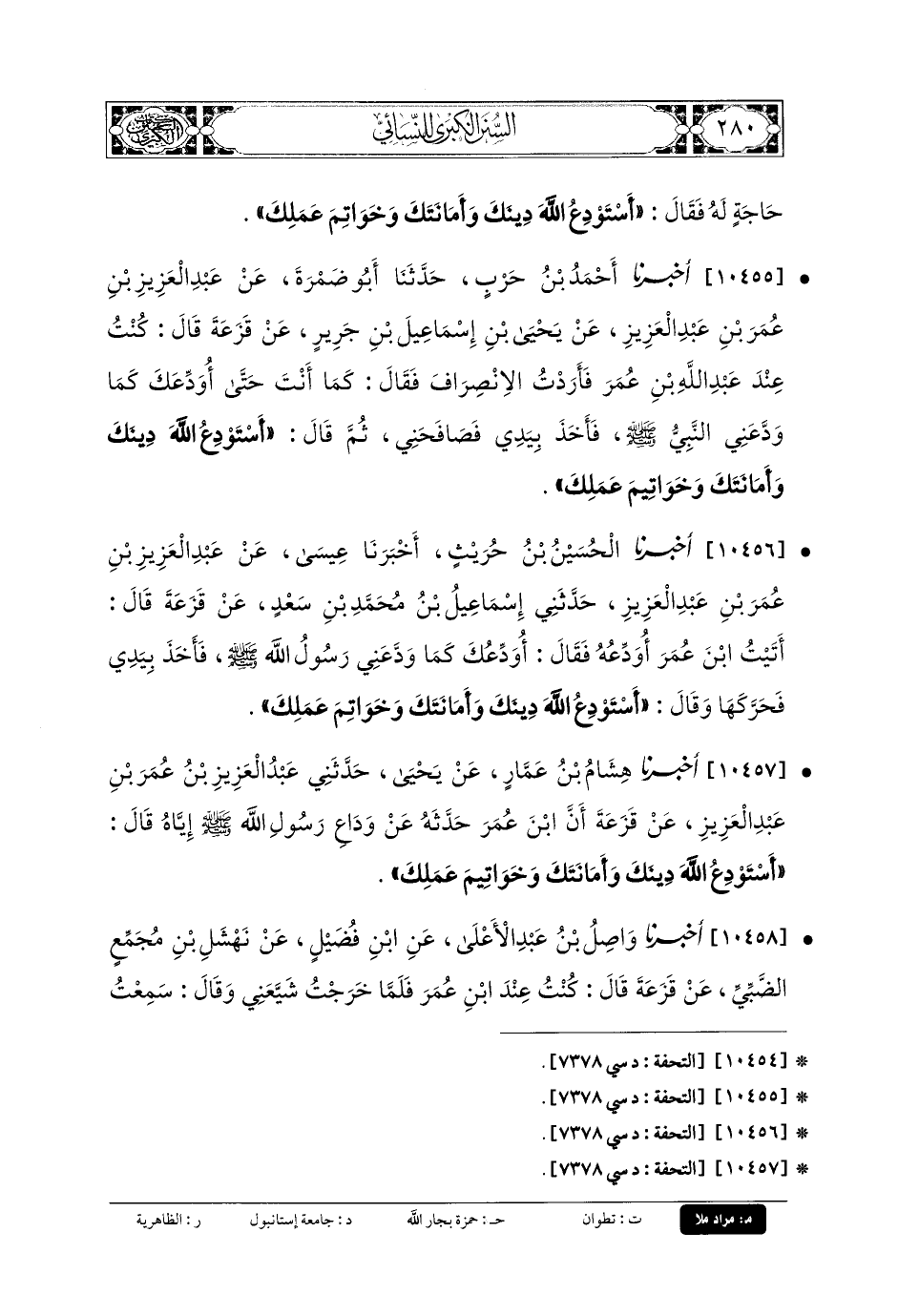 10455- أَخبَرنا أَحْمَدُ بنُ حَرْبٍ، حَدثنا أَبو ضَمْرَةَ، عَن عَبدِ العَزِيزِ بنِ عُمَرَ بنِ عَبدِ العَزِيزِ، عَن يَحيَى بنِ إِسمَاعِيلَ بنِ جَرِيرٍ، عَن قَزَعَةَ، قَالَ: كُنْتُ عِنْدَ عَبدِ اللهِ بنِ عُمَرَ، فَأَرَدْتُ الاِنْصِرَافَ فَقَالَ: كَمَا أَنْتَ حَتَّى أُوَدِّعَكَ كَمَا وَدَّعَنِي النَّبيُّ صَلى الله عَليه وسَلم، فَأَخَذَ بِيَدِي، فَصَافَحَنِي، ثُمَّ قَالَ: أَسْتَوْدِعُ اللهَ دِينَكَ، وَأَمَانَتَكَ، وَخَوَاتِيمَ عَمَلِكَ.