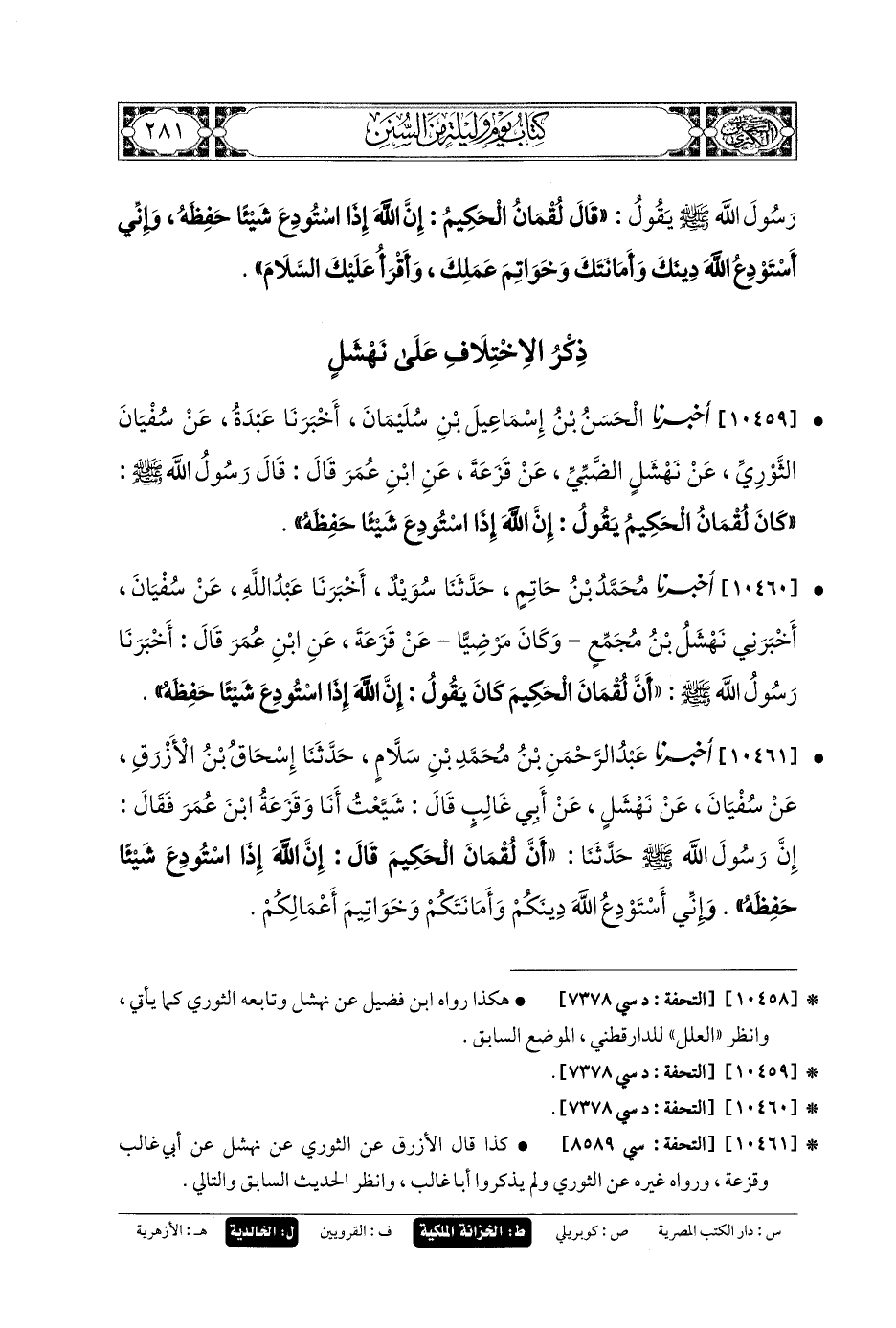 10459- أَخبَرنا الحَسَنُ بنُ إِسمَاعِيلَ بنِ سُلَيمَانَ، أَخبَرنا عَبدَةُ، عَن سُفيانَ الثَّوْرِيِّ، عَن نَهْشَلٍ الضَّبِّيِّ، عَن قَزَعَةَ، عَنِ ابنِ عُمَرَ، قَالَ: قَالَ رَسُولُ اللهِ صَلى الله عَليه وسَلم: كَانَ لُقْمَانُ الحَكِيمُ يَقُولُ: إِنَّ اللهَ إِذَا اسْتُودِعْ شَيْئًا حَفِظَهُ.