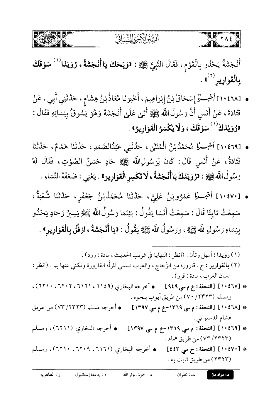 10469- أَخبَرنا مُحَمدُ بنُ المُثَنَّى، حَدَّثني عَبدُ الصَّمَدِ، حَدثنا هَمَّامٌ، حَدثنا قَتَادَةُ، عَن أَنَسٍ، قَالَ: كَانَ لِرَسُولِ اللهِ صَلى الله عَليه وسَلم حَادٍ حَسَنُ الصَّوْتِ، فَقَالَ لَهُ رَسُولُ اللهِ صَلى الله عَليه وسَلم: رُوَيْدَكَ يَا أَنْجَشَةُ، لا تَكْسِرِ القَوَارِيرُ، يَعْنِي ضَعَفَةَ النِّسَاءِ.