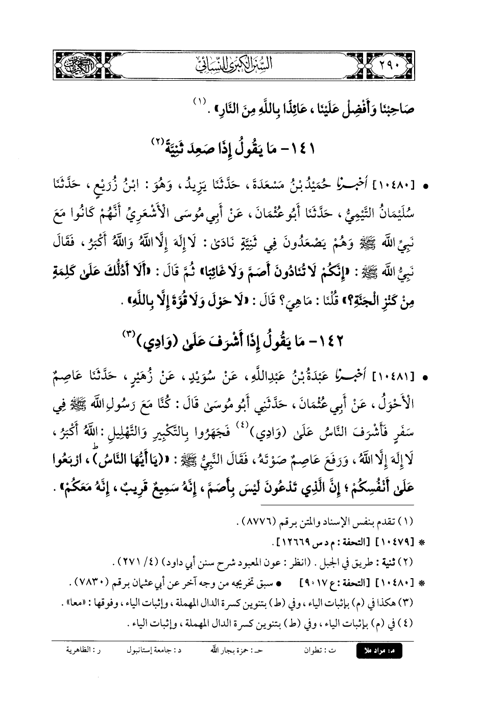 10480- أَخبَرنا حُمَيْدُ بنُ مَسْعَدَةَ، حَدثنا يَزِيدُ، وَهُوَ ابنُ زُرَيْعٍ، حَدثنا سُلَيمَانُ التَّيْمِيُّ، حَدثنا أَبو عُثْمَانَ، عَن أَبي مُوسَى الأَشْعَرِيِّ، أَنَّهُمْ كَانُوا مَعَ نَبِيِّ اللهِ صَلى الله عَليه وسَلم، وَهُمْ يَصْعَدُونَ فِي ثَنِيَّةٍ، نَادَى: لا إِلَهَ إِلاَّ اللهُ وَاللهُ أَكْبَرُ، فَقَالَ نَبِيُّ اللهِ صَلى الله عَليه وسَلم: إِنَّكُمْ لا تُنَادُونَ أَصَمَّ وَلا غَائِبًا، ثُمَّ قَالَ: أَلا أَدُلُّكَ عَلَى كَلِمَةٍ مِنْ كَنْزِ الجَنَّةِ؟ قُلْنَا: مَا هِيَ؟ قَالَ: لا حَوْلَ وَلا قُوَّةَ إِلاَّ بِاللَّهِ.