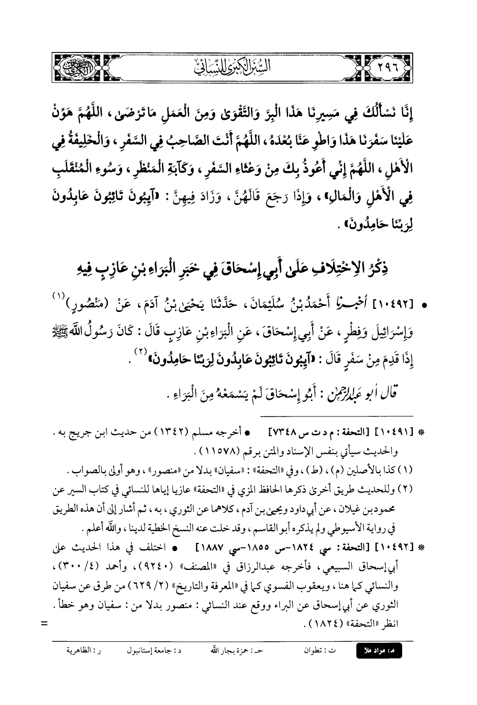 10491- أَخبَرنا سُلَيمَانُ بنُ دَاوُدَ، عَنِ ابنِ وَهْبٍ، أَخبَرني ابنُ جُرَيْجٍ، أَنَّ أَبَا الزُّبَيْرِ أَخبَرَهُ؛ أَنَّ عَليًّا الأَسْدِيَّ أَخبَرَهُ، أَنَّ عَبدَ اللهِ بْنَ عُمَرَ عَلَّمَهُ، أَنَّ رَسُولَ اللهِ صَلى الله عَليه وسَلم كَانَ إِذَا اسْتَوَى عَلَى بَعِيرِهِ خَارِجًا إِلَى السَّفَرِ، كَبَّرَ ثَلاثًا، وَقَالَ: سُبْحَانَ الَّذِي سَخَّرَ لَنَا هَذَا، وَمَا كُنَّا لَهُ مُقْرِنِينَ، وَإِنَّا إِلَى رَبِّنَا لَمُنْقَلِبُونَ، اللهُمَّ إِنَّا نَسْأَلُكَ فِي مَسِيرِنَا هَذَا البِرَّ وَالتَّقْوَى، وَمَنَ العَمَلِ مَا تَرْضَى، اللهُمَّ هَوِّنْ عَلَيْنَا سَفَرَنَا هَذَا، وَاطْوِ عَنَّا بُعْدَهُ، اللهُمَّ أَنْتَ الصَّاحِبُ فِي السَّفَرِ، وَالخَلِيفَةُ فِي الأَهْلِ، اللهُمَّ إِنِّي أَعُوذُ بِكَ مِنْ وَعْثَاءِ السَّفَرِ، وَكَآبَةِ المَنْظَرِ، وَسُوءِ المُنْقَلَبِ فِي الأَهْلِ وَالمَالِ، وَإِذَا رَجَعَ قَالَهُنَّ وَزَادَ فِيهِنَّ: آيِبُونَ، تَائِبُونَ، عَابِدُونَ، لِرَبِّنَا حَامِدُونَ.