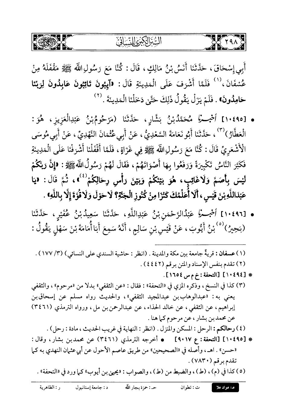 10494- أَخبَرنا عِمْرَانُ بنُ مُوسَى، حَدثنا عَبدُ الوَارِثِ، حَدثنا يَحيَى بنُ أَبي إِسحَاقَ، حَدثنا أَنَسُ بنُ مَالِكٍ، قَالَ: كُنَّا مَعَ رَسُولِ اللهِ صَلى الله عَليه وسَلم مَقْفَلَهُ مِنْ عُسْفَانَ، فَلَمَّا أَشْرَفَ عَلَى المَدِينَةِ قَالَ: آيِبُونَ، تَائِبُونَ، عَابِدُونَ، لِرَبِّنَا حَامِدُونَ، فَلَمْ يَزَلْ يَقُولُ ذَلِكَ حَتَّى دَخَلْنَا المَدِينَةَ.