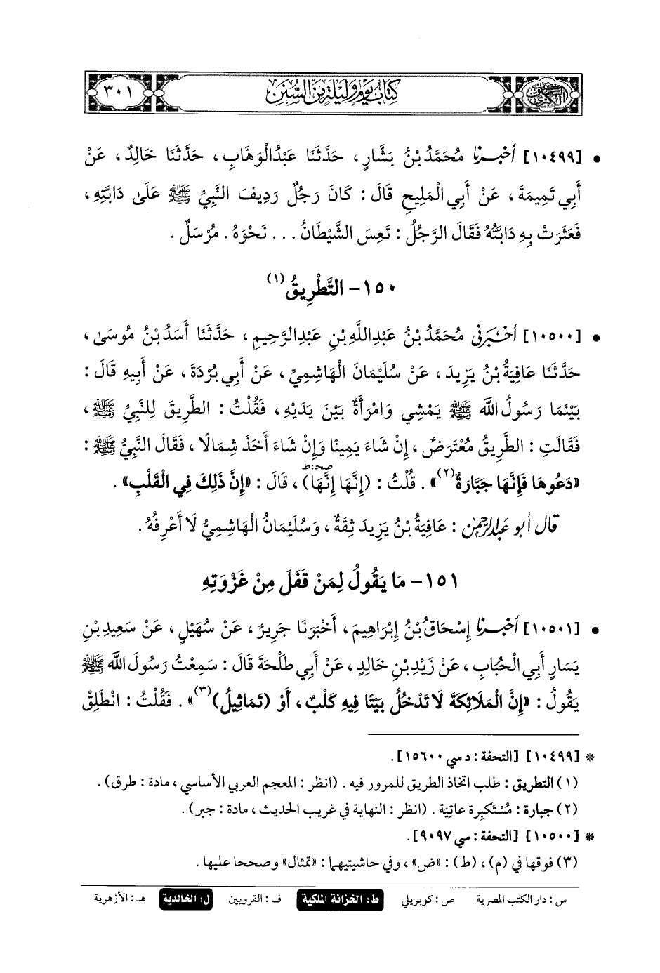 10499- أَخبَرنا مُحَمدُ بنُ بَشَّارٍ، حَدثنا عَبدُ الوَهَّابِ، حَدثنا خَالِدٌ، عَن أَبي تَمِيمَةَ، عَن أَبي المَلِيحِ، قَالَ: كَانَ رَجُلٌ رَدِيفَ النَّبيِّ صَلى الله عَليه وسَلم عَلَى دَابَّتِهِ، فَعَثَرَتْ بِهِ دَابَّتُهُ، فَقَالَ الرَّجُلُ: تَعِسَ الشَّيْطَانُ، نَحْوَهُ مُرْسَلٌ.
