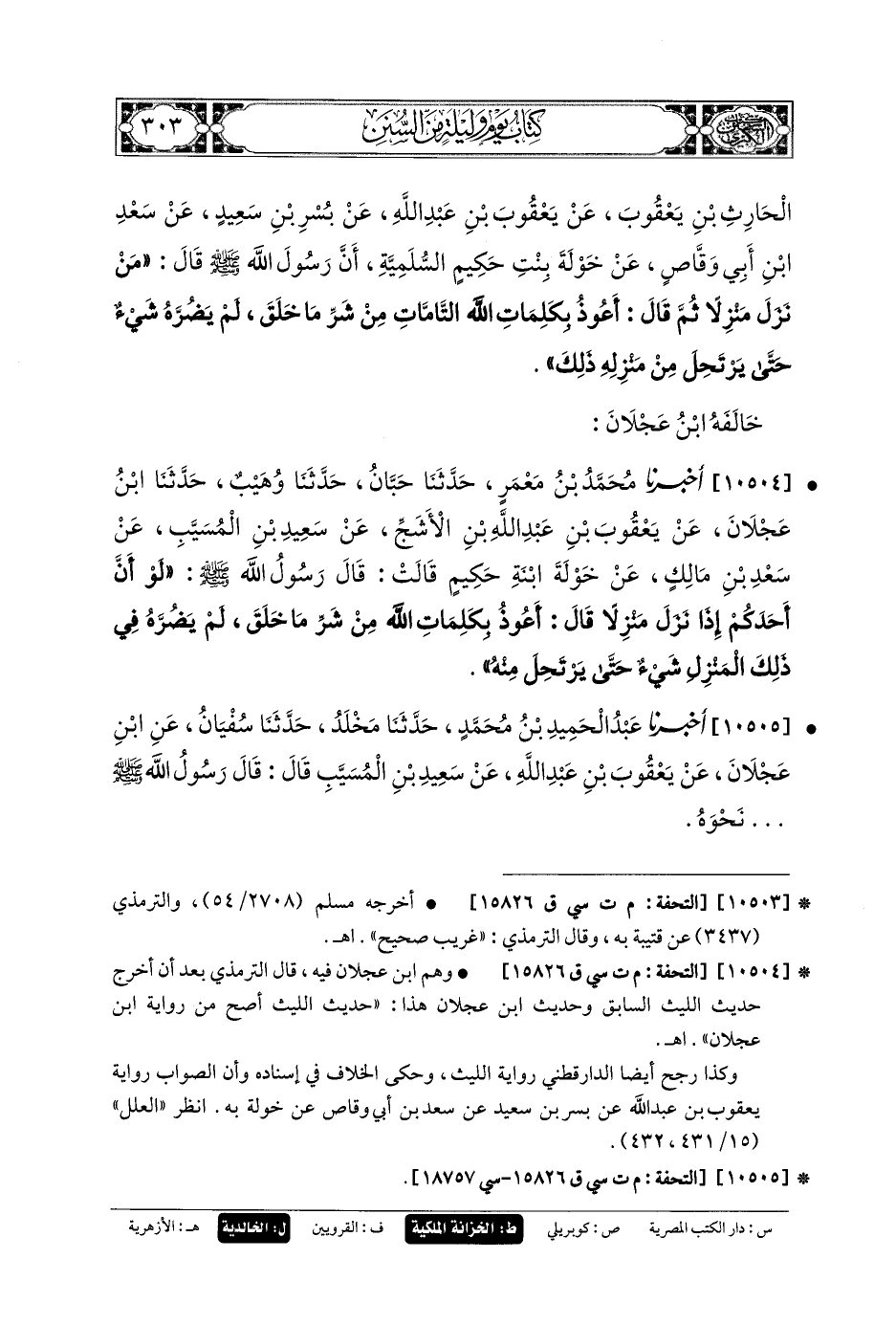 10503- أَخبَرنا قُتَيبَةُ بنُ سَعِيدٍ، حَدثنا اللَّيْثُ، عَن يَزِيدَ بنِ أَبي حَبِيبٍ، عَنِ الحَارِثِ بنِ يَعقُوبَ، عَن يَعقُوبَ بنِ عَبدِ اللهِ، عَن بُسْرِ بنِ سَعِيدٍ، عَن سَعْدِ بنِ أَبي وَقَّاصٍ، عَن خَوْلَةَ بِنْتِ حَكِيمٍ السُّلَمِيَّةِ، أَنَّ رَسُولَ اللهِ صَلى الله عَليه وسَلم قَالَ: مَنْ نَزَلَ مَنْزِلاً، ثُمَّ قَالَ: أَعُوذُ بِكَلِمَاتِ اللهِ التَّامَّاتِ مِنْ شَرِّ مَا خَلَقَ، لَمْ يَضُرَّهُ شَيْءٌ حَتَّى يَرْتَحِلَ مِنْ مَنْزِلِهِ ذَلِكَ.