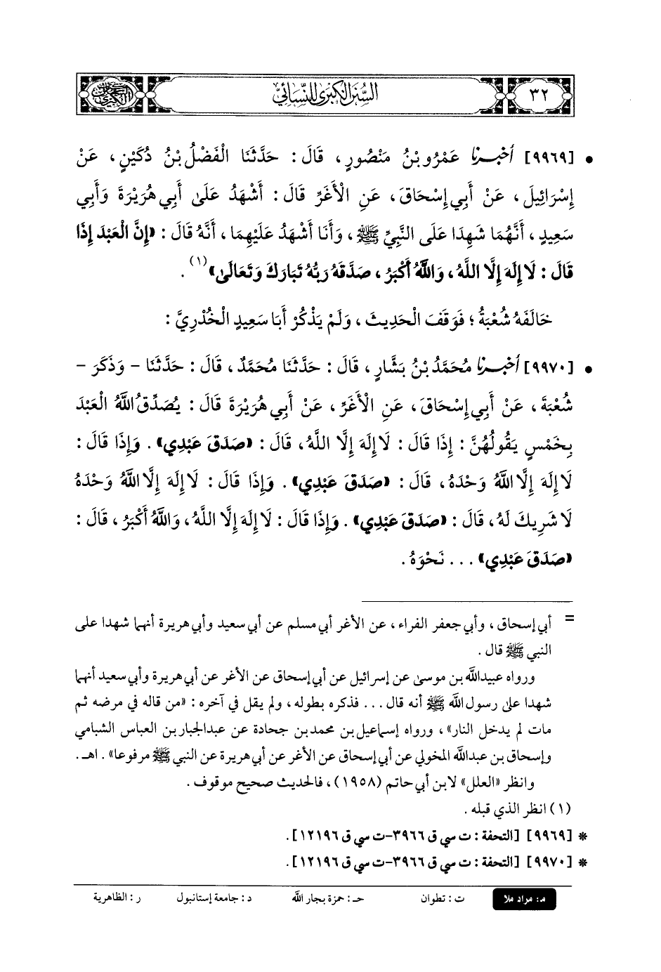 9969- أَخبَرنا عَمرُو بنُ مَنصُورٍ، قَالَ: حَدثنا الفَضْلُ بنُ دُكَيْنٍ، عَن إِسرَائِيلَ، عَن أَبي إِسحَاقَ، عَنِ الأَغَرِّ قَالَ: أَشْهَدُ عَلَى أَبي هُرَيرَةَ، وَأَبي سَعِيدٍ، أَنَّهُمَا شَهِدَا عَلَى النَّبيِّ صَلى الله عَليه وسَلم، وَأَنَا أَشْهَدُ عَلَيْهِمَا أَنَّهُ قَالَ: إِنَّ العَبدَ إِذَا قَالَ: لا إِلَهَ إِلاَّ اللهُ، وَاللهُ أَكْبَرُ، صَدَّقَهُ رَبُّهُ تَبَارَكَ وَتَعَالَى.