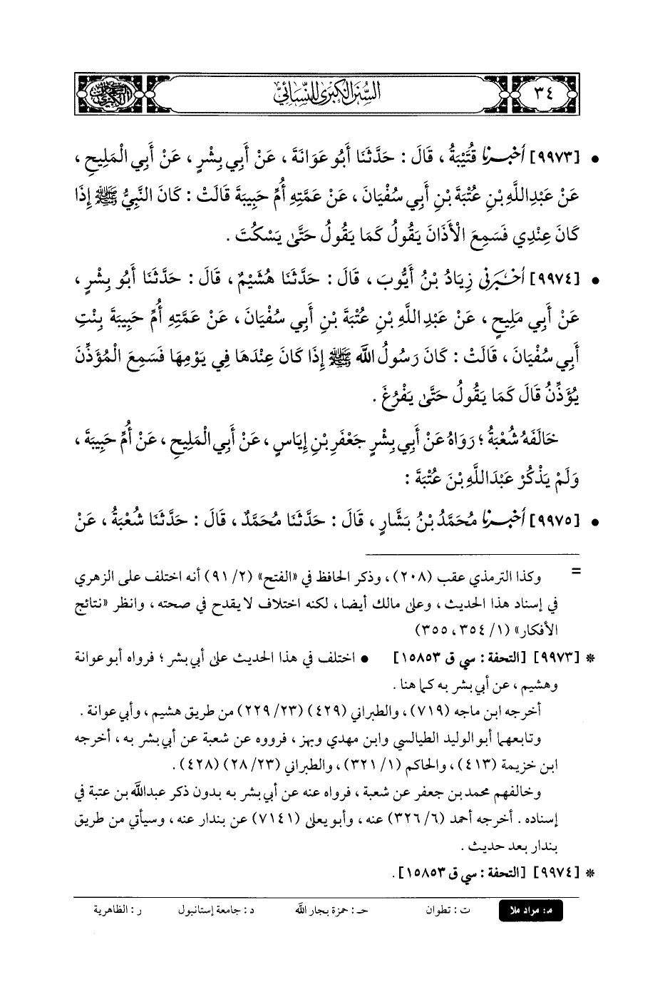 9973- أَخبَرنا قُتَيبَةُ، قَالَ: حَدثنا أَبو عَوَانَةَ، عَن أَبي بِشْرٍ، عَن أَبي المَلِيحِ، عَن عَبدِ اللهِ بنِ عُتْبَةَ بنِ أَبي سُفيانَ، عَن عَمَّتِهِ أُمِّ حَبِيبَةَ قَالَتْ: كَانَ النَّبيُّ صَلى الله عَليه وسَلم إِذَا كَانَ عِنْدِي فَسَمِعَ الأَذَانَ يَقُولُ كَمَا يَقُولُ حَتَّى يَسْكُتَ.
