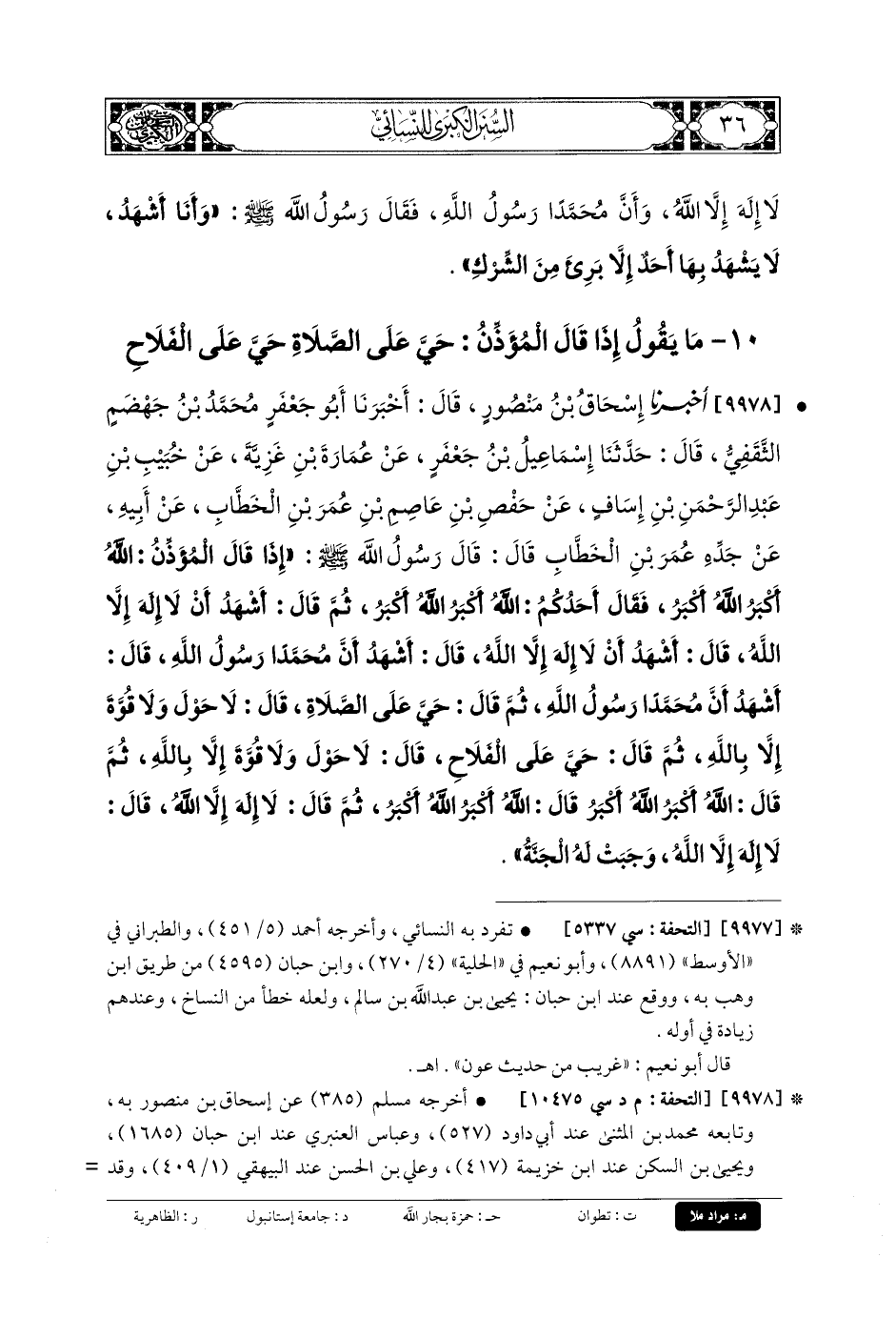 9977- أَخبَرنا عَمرُو بنُ مَنصُورٍ، قَالَ: حَدثنا أصْبَغُ بنُ فَرَجٍ، قَالَ: أَخبَرني ابنُ وَهْبٍ، عَن عَمْرٍو، عَن سَعِيدِ بنِ أَبي هِلالٍ، أَنَّ يَحيَى بْنَ عَبدِ الرَّحمَنِ حَدَّثَهُ عَن عَوْنِ بنِ عَبدِ اللهِ، عَن يُوسُفَ بنِ عَبدِ اللهِ بنِ سَلامٍ، عَن أَبيهِ، قَالَ: بَيْنَمَا نَحْنُ نَسِيرُ مَعَ رَسُولِ اللهِ صَلى الله عَليه وسَلم سَمِعَ رَجُلاً فِي الوَادِي يَقُولُ: أَشْهَدُ أَنْ لا إِلَهَ إِلاَّ اللهُ، وَأَنَّ مُحَمدًا رَسُولُ اللهِ، فَقَالَ رَسُولُ اللهِ صَلى الله عَليه وسَلم: وَأَنَا أَشْهَدُ، لا يَشْهَدُ بِهَا أَحَدٌ إِلاَّ بَرِئَ مِنَ الشِّرْكِ.
