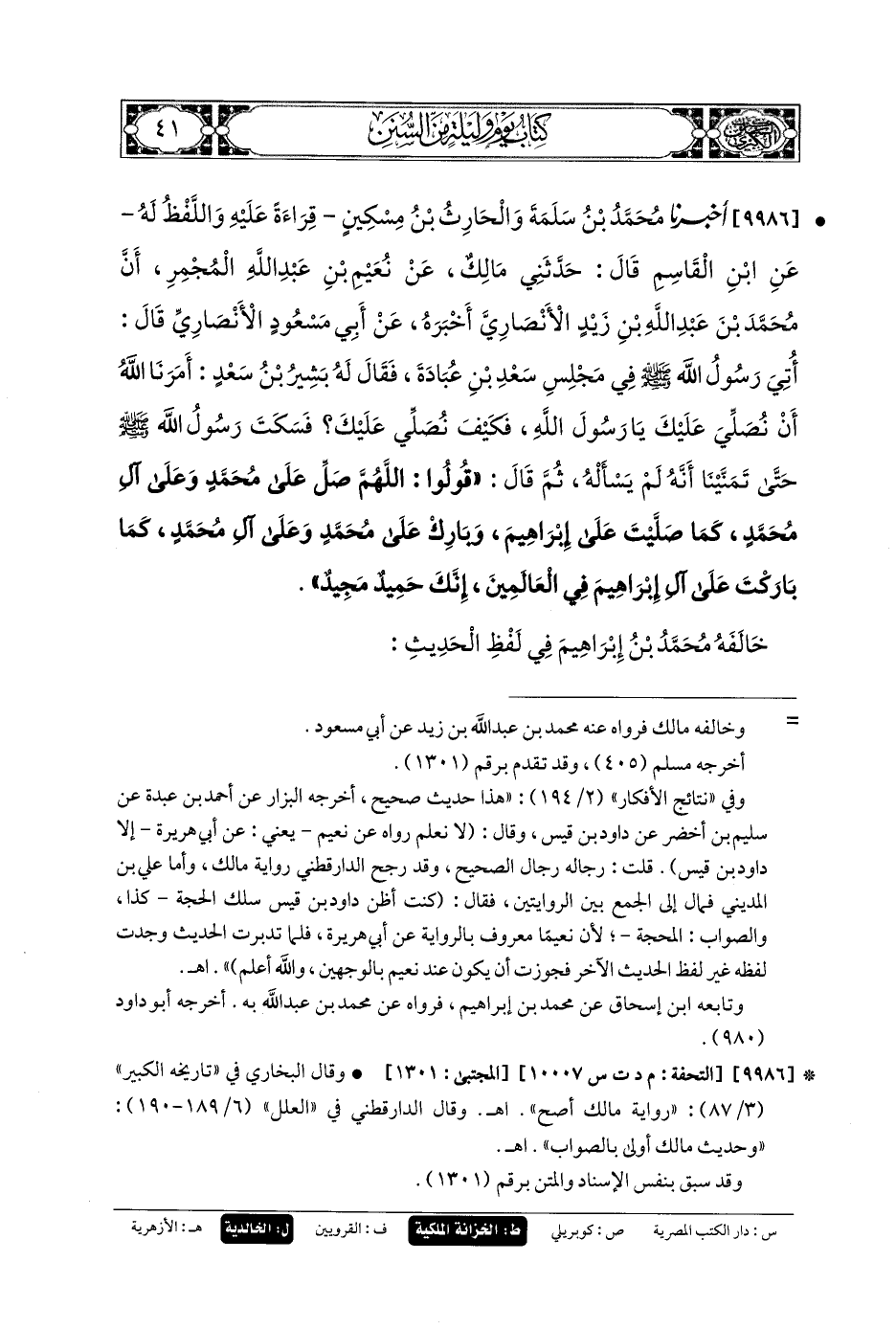 9985- أَخبَرنا حَاجِبُ بنُ سُلَيمَانَ، قَالَ: حَدثنا ابنُ أَبي فُدَيْكٍ، قَالَ: حَدثنا دَاوُدُ بنُ قَيسٍ، عَن نُعَيْمِ بنِ عَبدِ اللهِ المُجْمِرِ، عَن أَبي هُرَيرَةَ قَالَ: قُلْنَا: يَا رَسُولَ اللهِ، كَيْفَ نُصَلِّي عَلَيْكَ؟ قَالَ: قُولُوا: اللهُمَّ صَلِّ عَلَى مُحَمدٍ وَعَلَى آلِ مُحَمدٍ، وَبَارِكْ عَلَى مُحَمدٍ، وَعَلَى آلِ مُحَمدٍ، كَمَا صَلَّيْتَ عَلَى إِبرَاهِيمَ وَآلِ إِبرَاهِيمَ، إِنَّكَ حَمِيدٌ مَجِيدٌ، وَالسَّلامُ كَمَا قَدْ عَلِمْتُمْ.