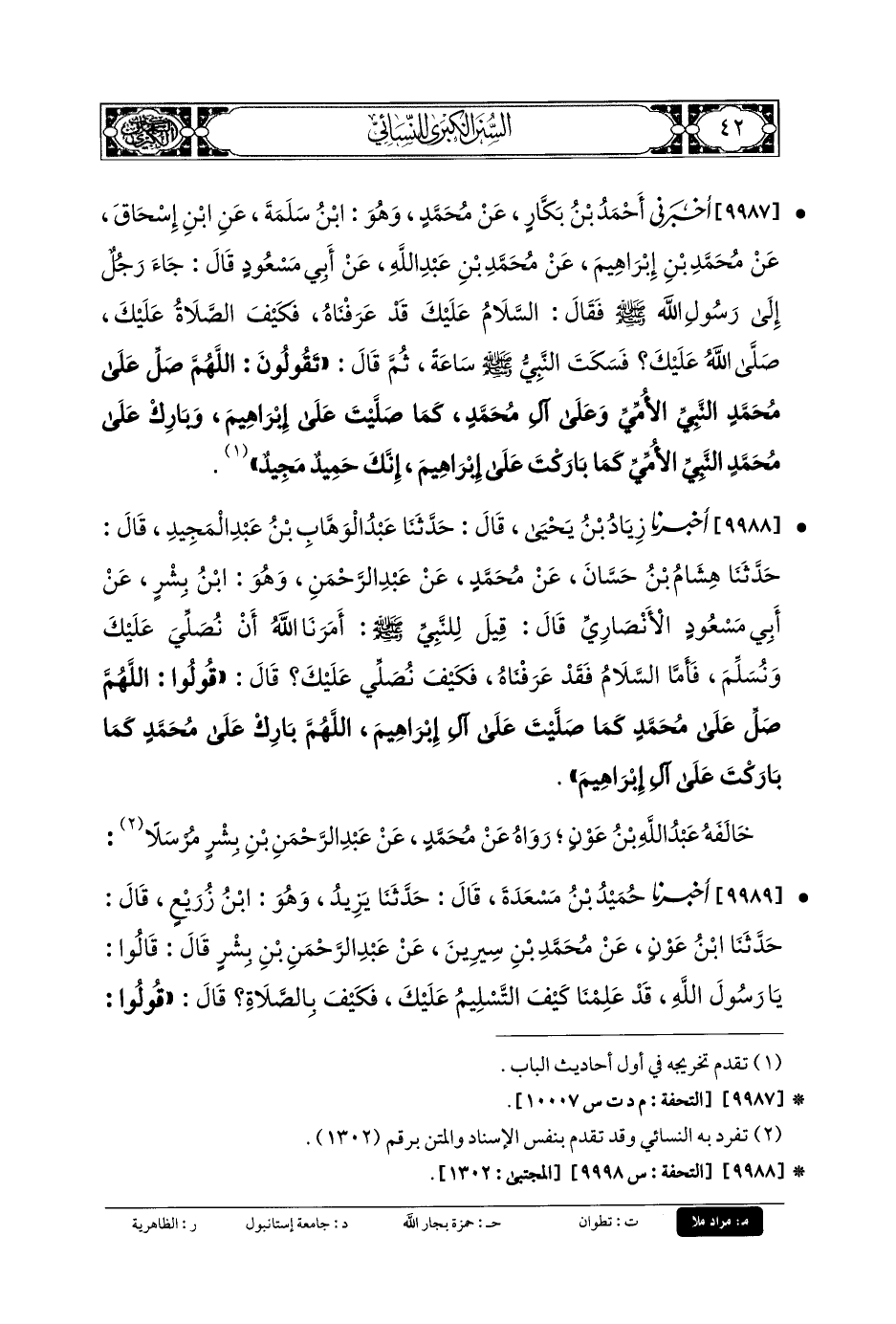 9988- أَخبَرنا زِيَادُ بنُ يَحيَى، قَالَ: حَدثنا عَبدُ الوَهَّابِ بنُ عَبدِ المَجِيدِ، قَالَ: حَدثنا هِشَامُ بنُ حَسَّانَ، عَن مُحَمدِ، عَن عَبدِ الرَّحمَنِ، وَهُوَ ابنُ بِشْرٍ، عَن أَبي مَسْعُودٍ الأَنْصَارِيِّ قَالَ: قِيلَ لِلنَّبِيِّ صَلى الله عَليه وسَلم: أَمَرَنَا اللهُ أَنْ نُصَلِّيَ عَلَيْكَ وَنُسَلِّمَ، فَأَمَّا السَّلامُ فَقَدْ عَرَفْنَاهُ، فَكَيْفَ نُصَلِّي عَلَيْكَ؟ قَالَ: قُولُوا: اللهُمَّ صَلِّ عَلَى مُحَمدٍ، كَمَا صَلَّيْتَ عَلَى آلِ إِبرَاهِيمَ، اللهُمَّ بَارِكْ عَلَى مُحَمدٍ، كَمَا بَارَكْتَ عَلَى آلِ إِبرَاهِيمَ.