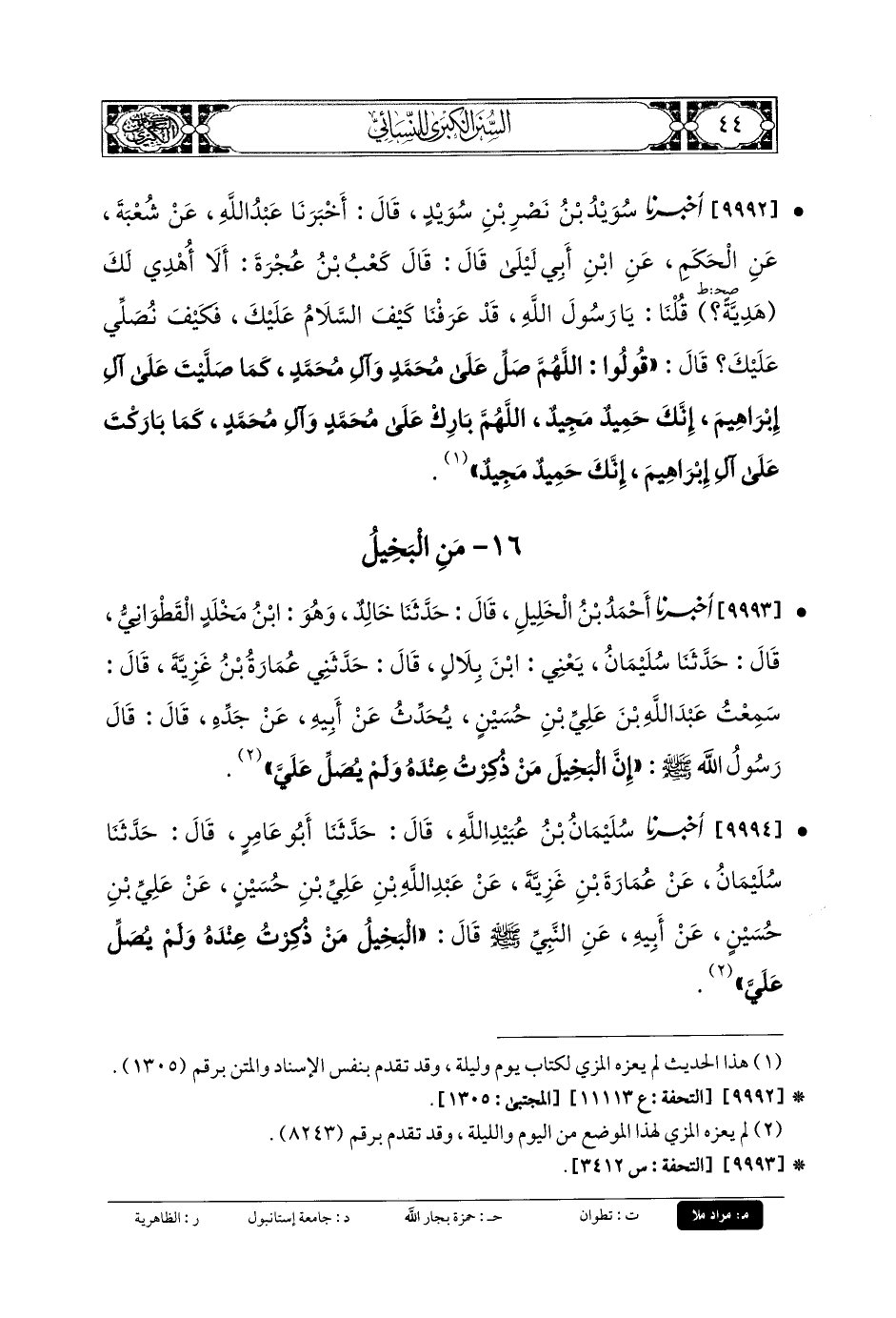 9993- أَخبَرنا أَحْمَدُ بنُ الخَلِيلِ، قَالَ: حَدثنا خَالِدٌ، وَهُوَ ابنُ مَخْلَدٍ القَطَوَانِيُّ، قَالَ: حَدثنا سُلَيمَانُ، يَعْنِي ابنَ بِلالٍ، قَالَ: حَدَّثني عُمَارَةُ بنُ غَزِيَّةَ، قَالَ: سَمِعْتُ عَبدَ اللهِ بْنَ عَليِّ بنِ حُسَيْنٍ يُحَدِّثُ عَن أَبيهِ، عَن جَدِّهِ قَالَ: قَالَ رَسُولُ اللهِ صَلى الله عَليه وسَلم: إنَّ البَخِيلَ مَنْ ذُكِرْتُ عِنْدَهُ وَلَمْ يُصَلِّ عَلَيَّ.