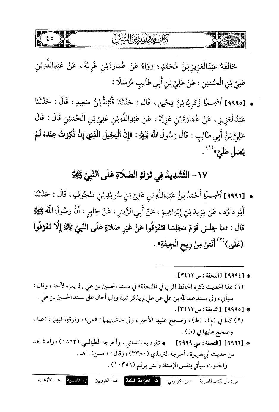 9995- أَخبَرنا زَكَرِيَّا بنُ يَحيَى، قَالَ: حَدثنا قُتَيبَةُ بنُ سَعِيدٍ، قَالَ: حَدثنا عَبدُ العَزِيزِ، عَن عُمَارَةَ بنِ غَزِيَّةَ، عَن عَبدِ اللهِ بنِ عَليِّ بنِ الحُسَيْنِ قَالَ: قَالَ عَليُّ بنُ أَبي طَالِبٍ: قَالَ رَسُولُ اللهِ صَلى الله عَليه وسَلم: إنَّ البَخِيلَ الَّذِي إنْ ذُكِرْتُ عِنْدَهُ لَمْ يُصَلِّ عَلَيَّ.