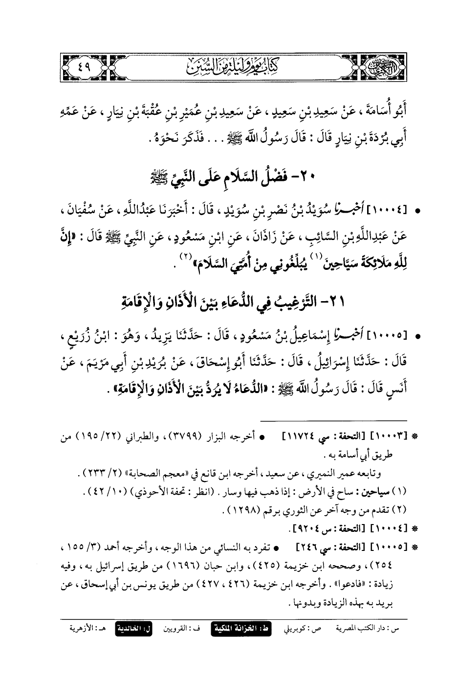10004- أَخبَرنا سُوَيْدُ بنُ نَصْرِ بنِ سُوَيْدٍ، قَالَ: أَخبَرنا عَبدُ اللهِ، عَن سُفيانَ، عَن عَبدِ اللهِ بنِ السَّائِبِ، عَن زَاذَانَ، عَنِ ابنِ مَسْعُودٍ، عَنِ النَّبيِّ صَلى الله عَليه وسَلم قَالَ: إنَّ للهِ مَلائِكَةً سَيَّاحِينَ، يُبَلِّغُونِي مِنْ أُمَّتِي السَّلامُ.
