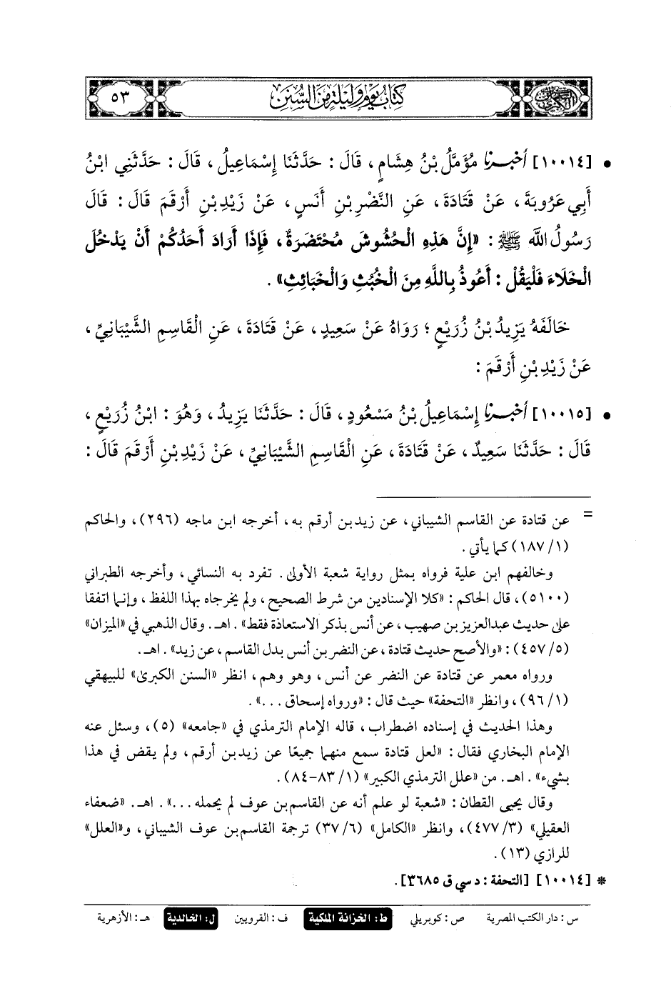 10014- أَخبَرنا مُؤَمَّلُ بنُ هِشَامٍ، قَالَ: حَدثنا إِسمَاعِيلُ، قَالَ: حَدَّثني ابنُ أَبي عَرُوبَةَ، عَن قَتَادَةَ، عَنِ النَّضْرِ بنِ أَنَسٍ، عَن زَيْدِ بنِ أَرْقَمَ قَالَ: قَالَ رَسُولُ اللهِ صَلى الله عَليه وسَلم: إنَّ هَذِهِ الحُشُوشَ مُحْتَضَرَةٌ، فَإِذَا أَرَادَ أَحَدُكُمُ أنْ يَدْخُلَ الخَلاءَ فَلْيَقُلْ: أَعُوذُ بِاللهِ مِنَ الخُبُثِ وَالخَبَائِثِ.