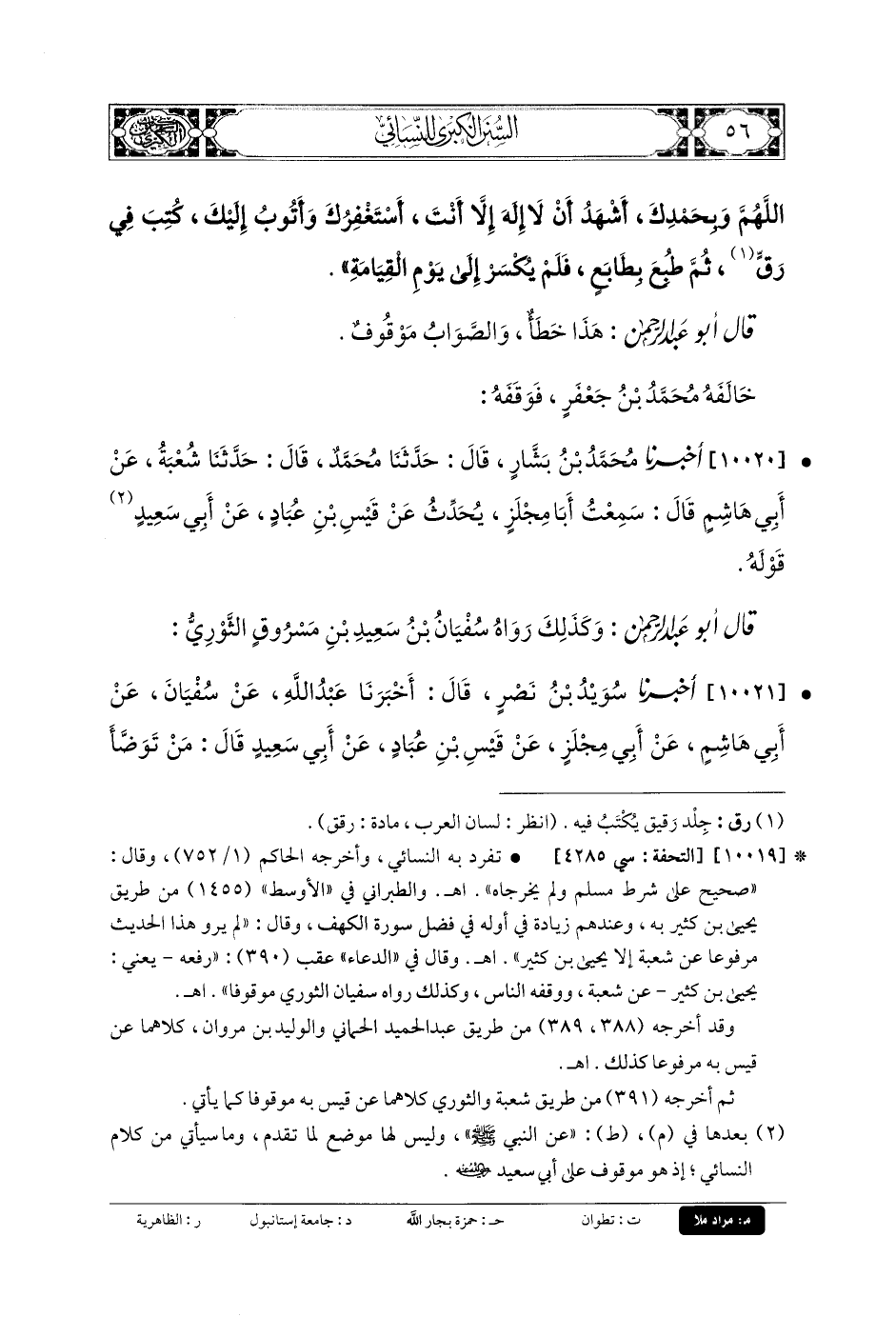 10019- أَخبَرنا يَحيَى بنُ مُحَمدِ بنِ السَّكَنِ، قَالَ: حَدثنا يَحيَى بنُ كَثِيرٍ أَبو غَسَّانَ، قَالَ: حَدثنا شُعبَةُ، قَالَ: حَدثنا أَبو هَاشِمٍ، عَن أَبي مِجْلَزٍ، عَن قَيْسِ بنِ عُبَادٍ، عَن أَبي سَعِيدٍ، عَنِ النَّبيِّ صَلى الله عَليه وسَلم قَالَ: مَنْ تَوَضَّأَ فَقَالَ: سُبْحَانَكَ اللهُمَّ، وَبِحَمْدِكَ أَشْهَدُ أَنْ لا إِلَهَ إِلاَّ أَنْتَ، أَسْتَغْفِرُكَ وَأَتُوبُ إِلَيْكَ، كُتِبَ فِي رَقٍّ، ثُمَّ طُبِعَ بِطَابَعٍ، فَلَمْ يُكْسَرْ إِلَى يَوْمِ القِيَامَةِ.