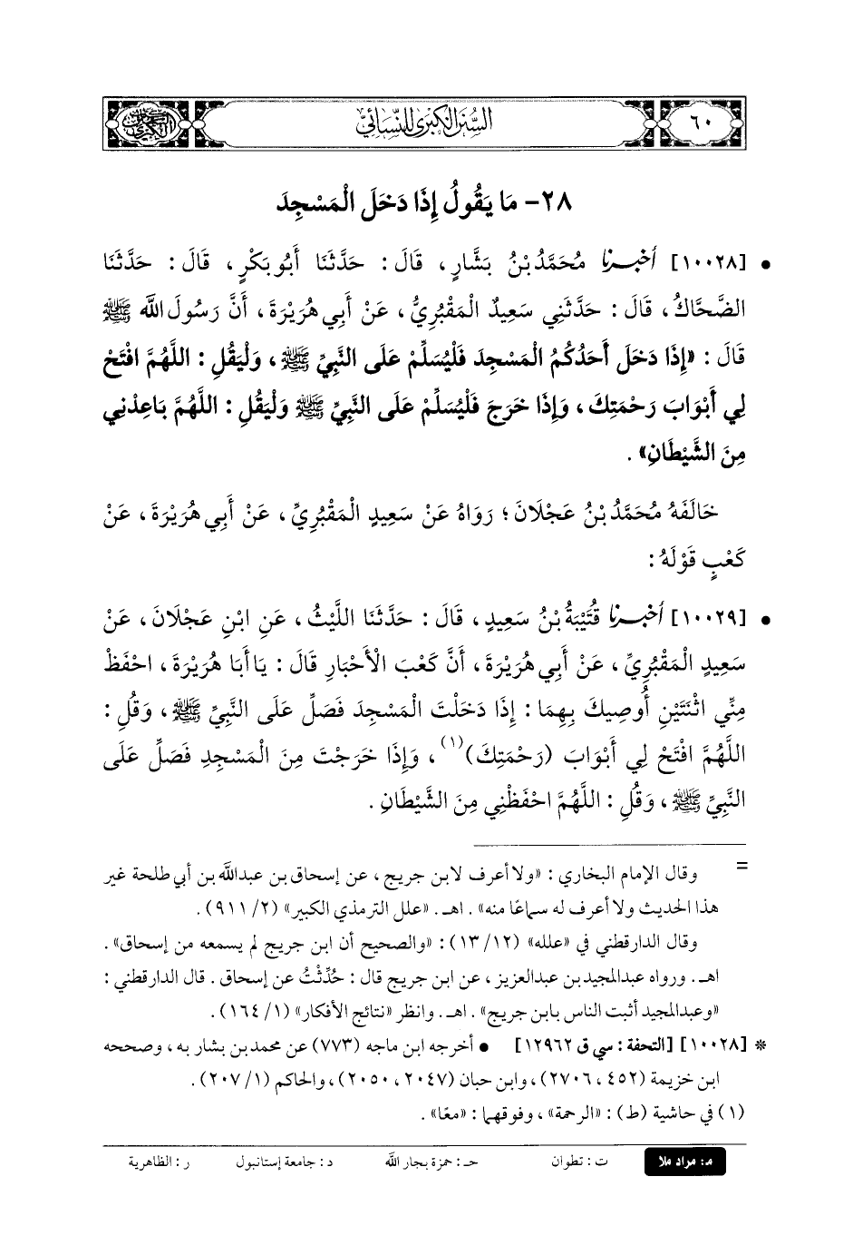 10028- أَخبَرنا مُحَمدُ بنُ بَشَّارٍ، قَالَ: حَدثنا أَبو بَكْرٍ، قَالَ: حَدثنا الضَّحَّاكُ، قَالَ: حَدَّثني سَعِيدٌ المَقْبُرِيُّ، عَن أَبي هُرَيرَةَ، أَنَّ رَسُولَ اللهِ صَلى الله عَليه وسَلم قَالَ: إِذَا دَخَلَ أَحَدُكُمُ المَسْجِدَ فَلْيُسَلِّمْ عَلَى النَّبيِّ صَلى الله عَليه وسَلم وَلْيَقُلْ: اللهُمَّ افْتَحْ لِي أَبْوَابَ رَحْمَتِكَ، وَإِذَا خَرَجَ فَلْيُسَلِّمْ عَلَى النَّبيِّ صَلى الله عَليه وسَلم وَلْيَقُلْ: اللهُمَّ بَاعِدْنِي مِنَ الشَّيْطَانِ.