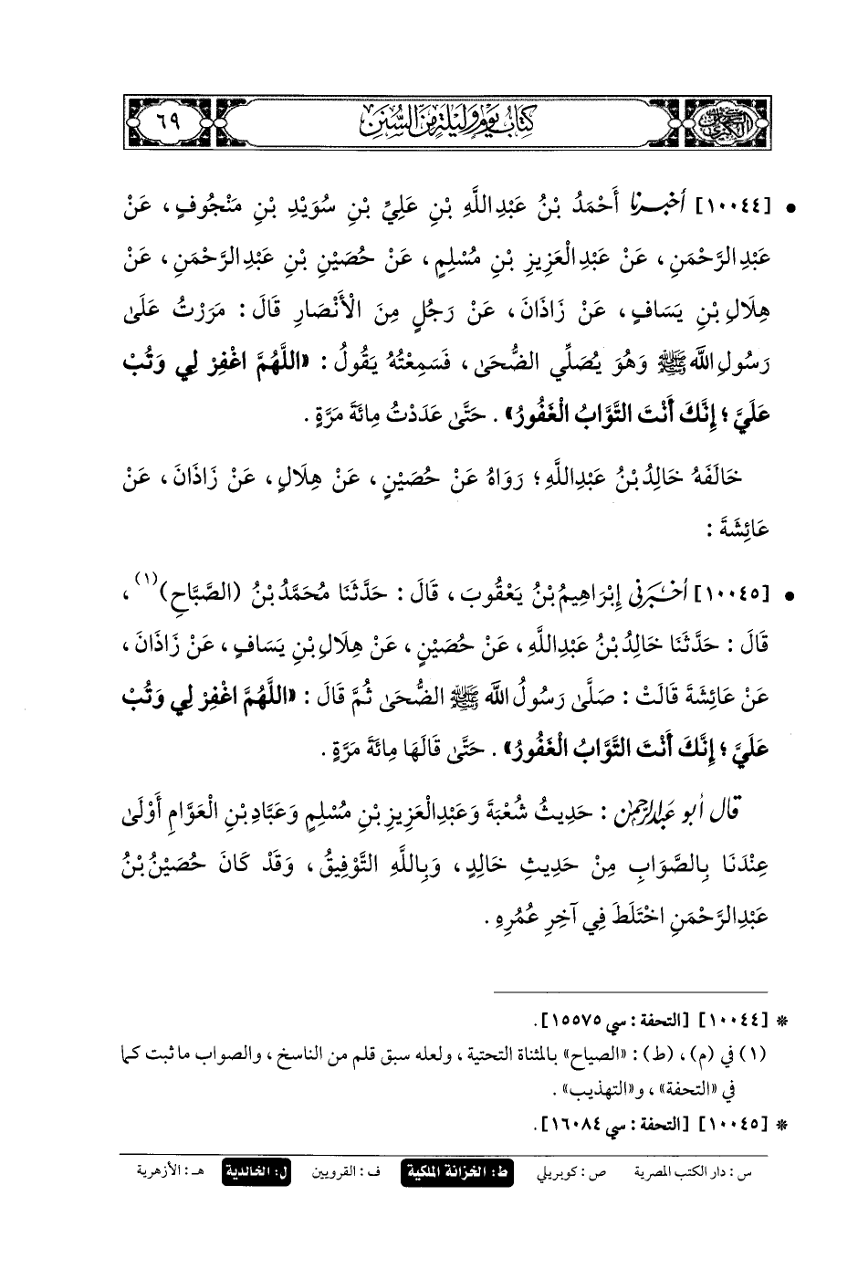10044- أَخبَرنا أَحْمَدُ بنُ عَبدِ اللهِ بنِ عَليِّ بنِ سُوَيْدِ بنِ مَنْجُوفٍ، عَن عَبدِ الرَّحمَنِ، عَن عَبدِ العَزِيزِ بنِ مُسْلِمٍ، عَن حُصَينِ بنِ عَبدِ الرَّحمَنِ، عَن هِلالِ بنِ يَسَافٍ، عَن زَاذَانَ، عَن رَجُلٍ مِنَ الأَنْصَارِ قَالَ: مَرَرْتُ عَلَى رَسُولِ اللهِ صَلى الله عَليه وسَلم وَهُوَ يُصَلِّي الضُّحَى، فَسَمِعْتُهُ يَقُولُ: اللهُمَّ اغْفِرْ لِي، وَتُبْ عَلَيَّ، إِنَّكَ أَنْتَ التَّوَّابُ الغَفُورُ، حَتَّى عَدَدْتُ مِئَةَ مَرَّةٍ.
