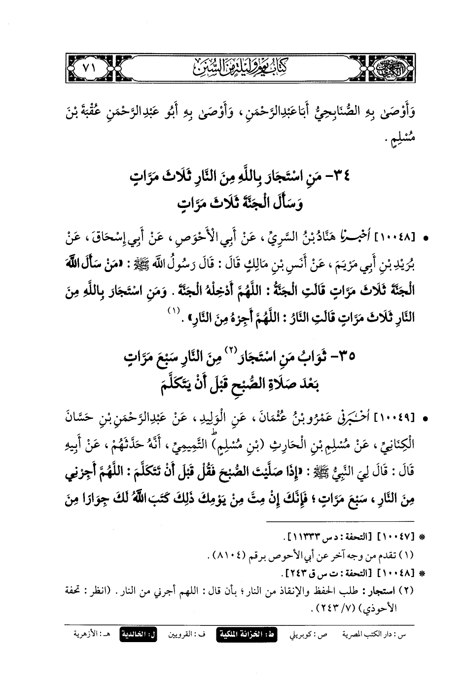 34- مَنِ اسْتَجَارَ بِاللهِ مِنَ النَّارِ ثَلاثَ مَرَّاتٍ، وَسَأَلَ الجَنَّةَ ثَلاثَ مَرَّاتٍ.