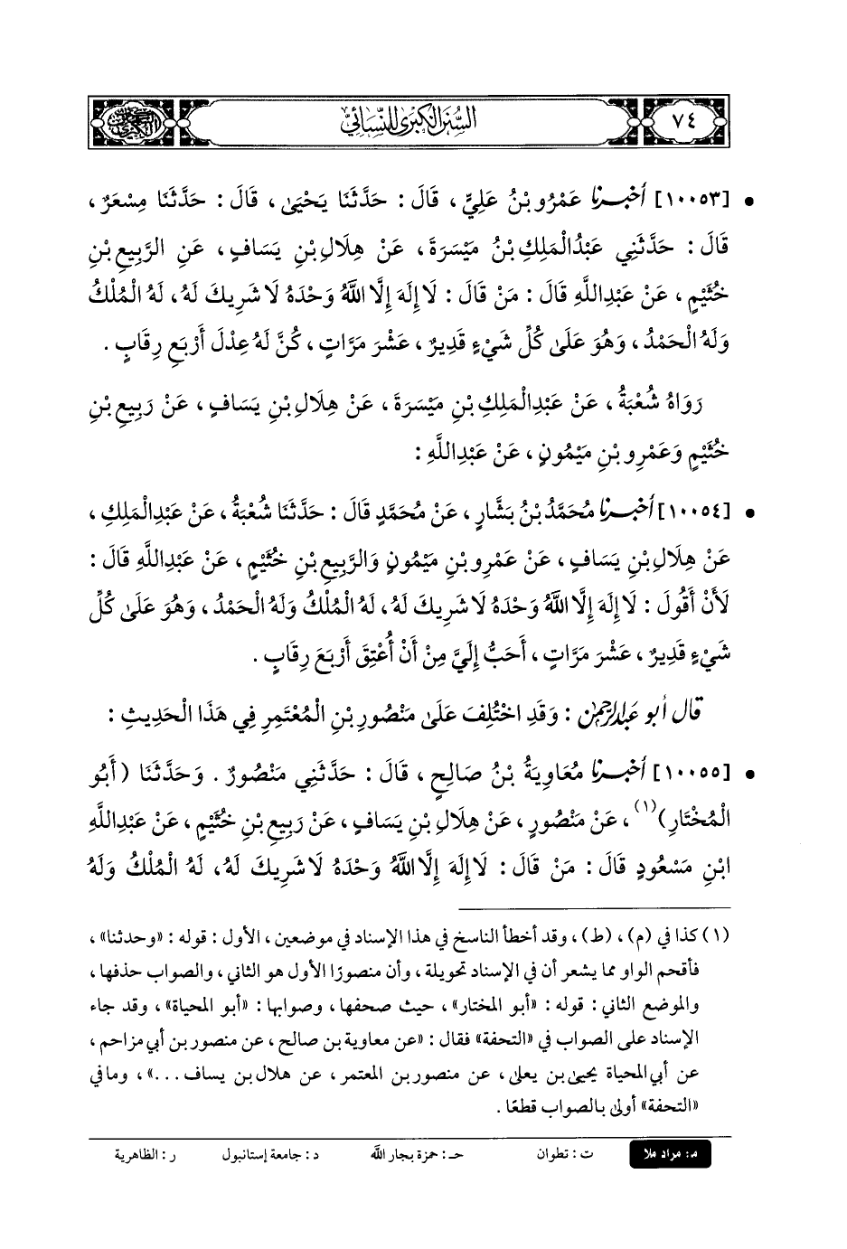 10053- أَخبَرنا عَمرُو بنُ عَليٍّ، قَالَ: حَدثنا يَحيَى، قَالَ: حَدثنا مِسْعَرٌ، قَالَ: حَدَّثني عَبدُ المَلِكِ بنُ مَيْسَرَةَ، عَن هِلالِ بنِ يَسَافٍ، عَنِ الرَّبِيعِ بنِ خُثَيْمٍ، عَن عَبدِ اللهِ قَالَ: مَنْ قَالَ: لا إِلَهَ إِلاَّ اللهُ، وَحْدَهُ لا شَرِيكَ لَهُ، لَهُ المُلْكُ وَلَهُ الحَمْدُ، وَهُوَ عَلَى كُلِّ شَيْءٍ قَدِيرٌ، عَشْرَ مَرَّاتٍ كُنَّ لَهُ عِدْلَ أَرْبَعِ رِقَابٍ.