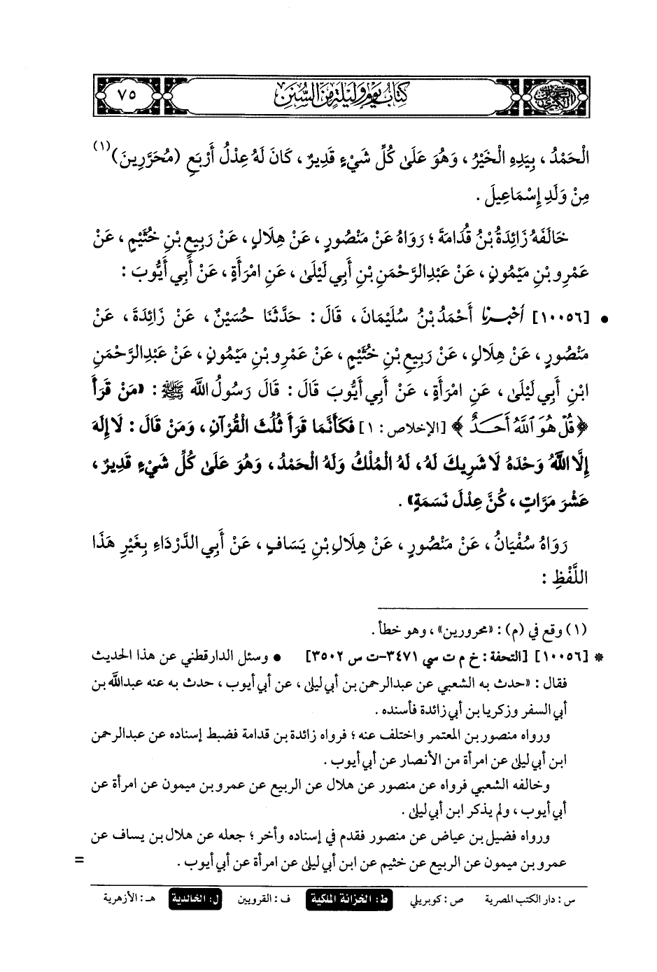 10055 - أَخبَرني مُعاويَةُ بنُ صَالِحٍ، قَالَ: حَدَّثني مَنصُورٌ، حَدثنا أَبو المُحَيَّاةِ (1)، عَن مَنصُورٍ، عَن هِلالِ بنِ يَسَافٍ، عَن رَبِيعِ بنِ خُثَيْمٍ، عَن عَبدِ اللهِ بنِ مَسْعُودٍ قَالَ: مَنْ قَالَ: لا إِلَهَ إِلاَّ اللهُ، وَحْدَهُ لا شَرِيكَ لَهُ، لَهُ المُلْكُ وَلَهُ الحَمْدُ، بِيَدِهِ الخَيْرُ وَهُوَ عَلَى كُلِّ شَيْءٍ قَدِيرٌ، كَانَ لَهُ عِدْلَ أَرْبَعِ مُحَرَّرِينَ مِنْ وَلَدِ إِسمَاعِيلَ.
