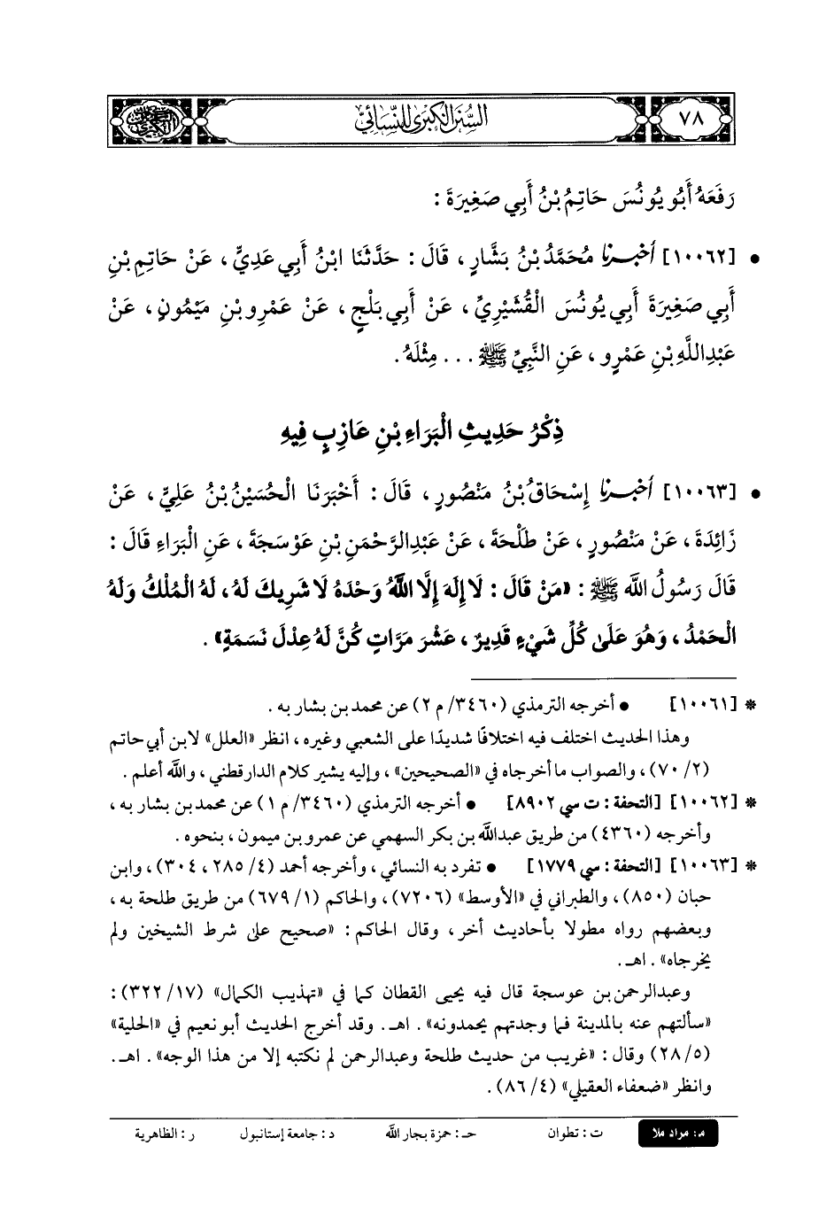 10062- أَخبَرنا مُحَمدُ بنُ بَشَّارٍ، قَالَ: حَدثنا ابنُ أَبي عَدِيٍّ، عَن حَاتِمِ بنِ أَبي صَغِيرَةَ أَبي يُونُسَ القُشَيْرِيِّ، عَن أَبي بَلْجٍ، عَن عَمْرِو بنِ مَيْمُونٍ، عَن عَبدِ اللهِ بنِ عَمْرٍو، عَنِ النَّبيِّ صَلى الله عَليه وسَلم، مِثْلَهُ.