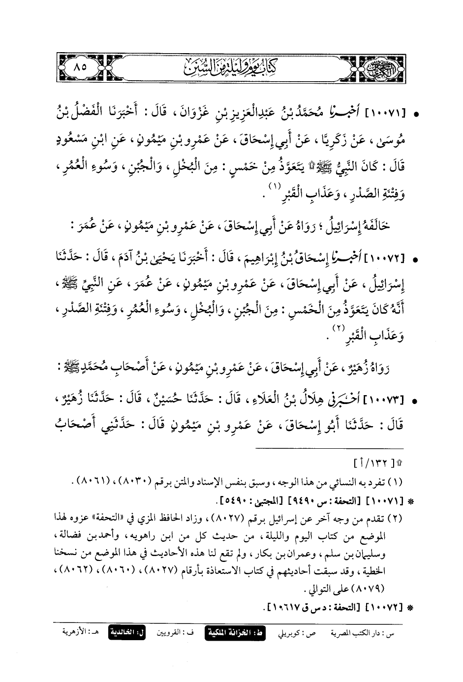 10072- أَخبَرنا إِسحَاقُ بنُ إِبرَاهِيمَ، قَالَ: أَخبَرنا يَحيَى بنُ آدَمَ، قَالَ: حَدثنا إِسرَائِيلُ، عَن أَبي إِسحَاقَ، عَن عَمْرِو بنِ مَيْمُونٍ، عَن عُمَرَ، عَنِ النَّبيِّ صَلى الله عَليه وسَلم، أَنَّهُ كَانَ يَتَعَوَّذُ مِنَ الخَمْسِ: مِنَ الجُبْنِ، وَالبُخْلِ، وَسُوءِ العُمُرِ، وَفِتْنَةِ الصَّدْرِ، وَعَذَابِ القَبْرِ.