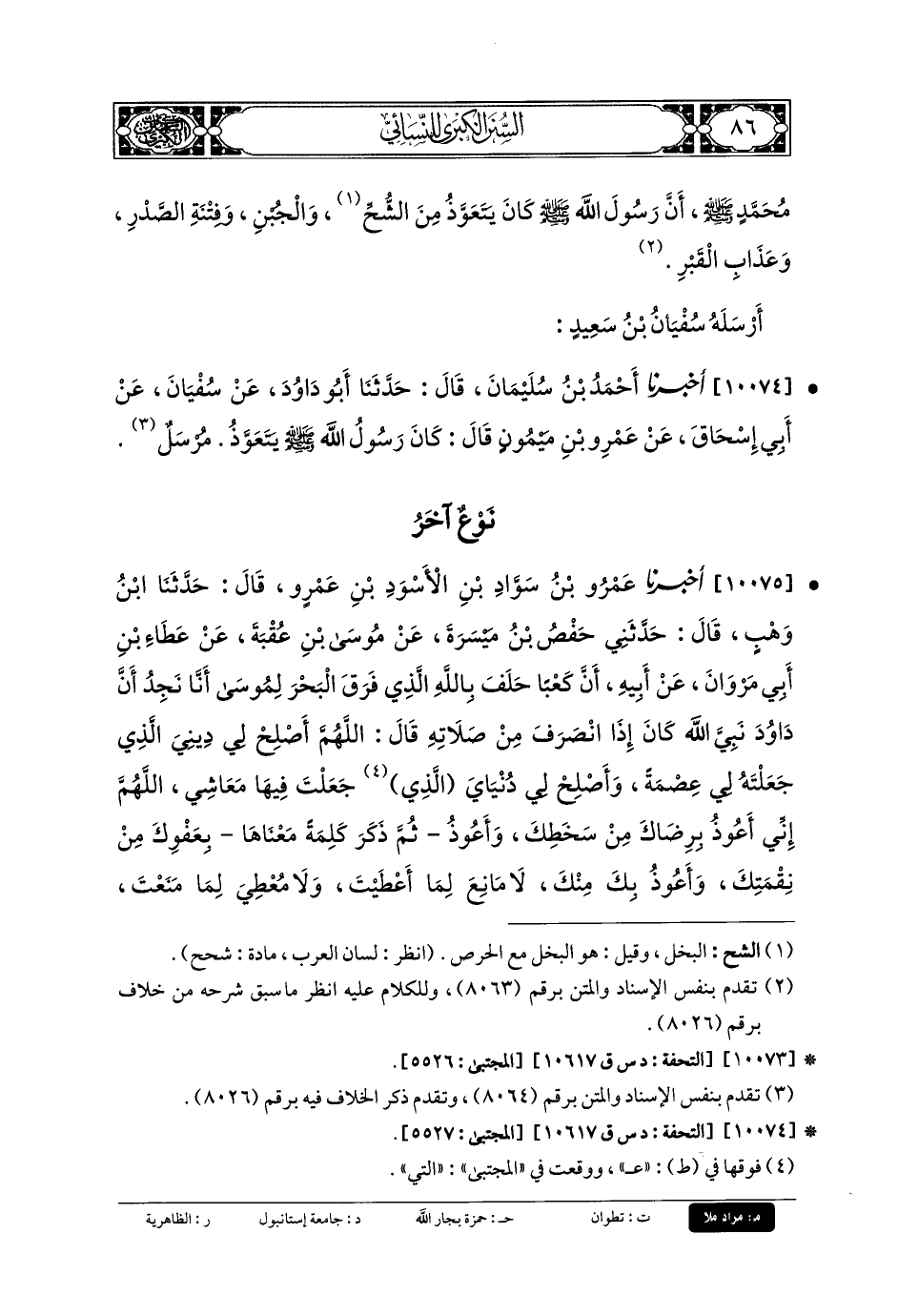 10074- أَخبَرنا أَحْمَدُ بنُ سُلَيمَانَ، قَالَ: حَدثنا أَبو دَاوُدَ، عَن سُفيانَ، عَن أَبي إِسحَاقَ، عَن عَمْرِو بنِ مَيْمُونٍ قَالَ: كَانَ رَسُولُ اللهِ صَلى الله عَليه وسَلم يَتَعَوَّذُ، مُرْسَلٌ.