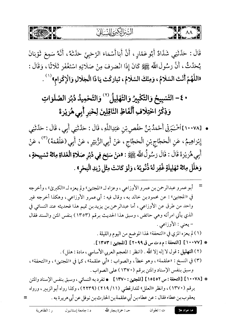 10077- أَخبَرني مَحْمُودُ بنُ خَالِدٍ، قَالَ: حَدَّثني الوَلِيدُ، عَن أَبي عَمْرٍو، قَالَ: حَدَّثني شَدَّادٌ أَبو عَمَّارٍ، أَنَّ أَبَا أَسْمَاءَ الرَّحَبِيَّ حَدَّثَهُ، أَنَّهُ سَمِعَ ثَوْبَانَ يُحَدِّثُ، أَنَّ رَسُولَ اللهِ صَلى الله عَليه وسَلم كَانَ إِذَا انْصَرَفَ مِنْ صَلاتِهِ اسْتَغْفَرَ ثَلاثًا وَقَالَ: اللهُمَّ أَنْتَ السَّلامُ وَمِنْكَ السَّلامُ، تَبَارَكْتَ يَا ذَا الجِلالِ وَالإِكْرَامِ.