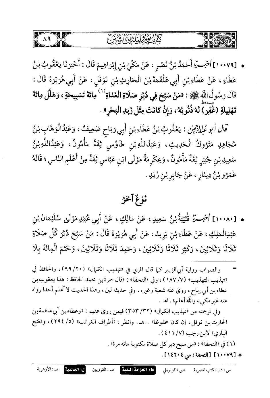 10079- أَخبَرنا أَحْمَدُ بنُ نَصْرٍ، عَن مَكِّيِّ بنِ إِبرَاهِيمَ، قَالَ: أَخبَرنا يَعقُوبُ بنُ عَطَاءٍ، عَن عَطَاءِ بنِ أَبي عَلْقَمَةَ بنِ الحَارِثِ بنِ نَوْفَلٍ، عَن أَبي هُرَيرَةَ قَالَ: قَالَ رَسُولُ اللهِ صَلى الله عَليه وسَلم: مَنْ سَبَّحَ فِي دُبُرِ صَلاةِ الغَدَاةِ مِئَةَ تَسْبِيحَةٍ، وَهَلَّلَ مِئَةَ تَهْلِيلَةٍ، غُفِرَ لَهُ ذُنُوبُهُ، وَإنْ كَانَتْ مِثْلَ زَبَدِ البَحْرِ.